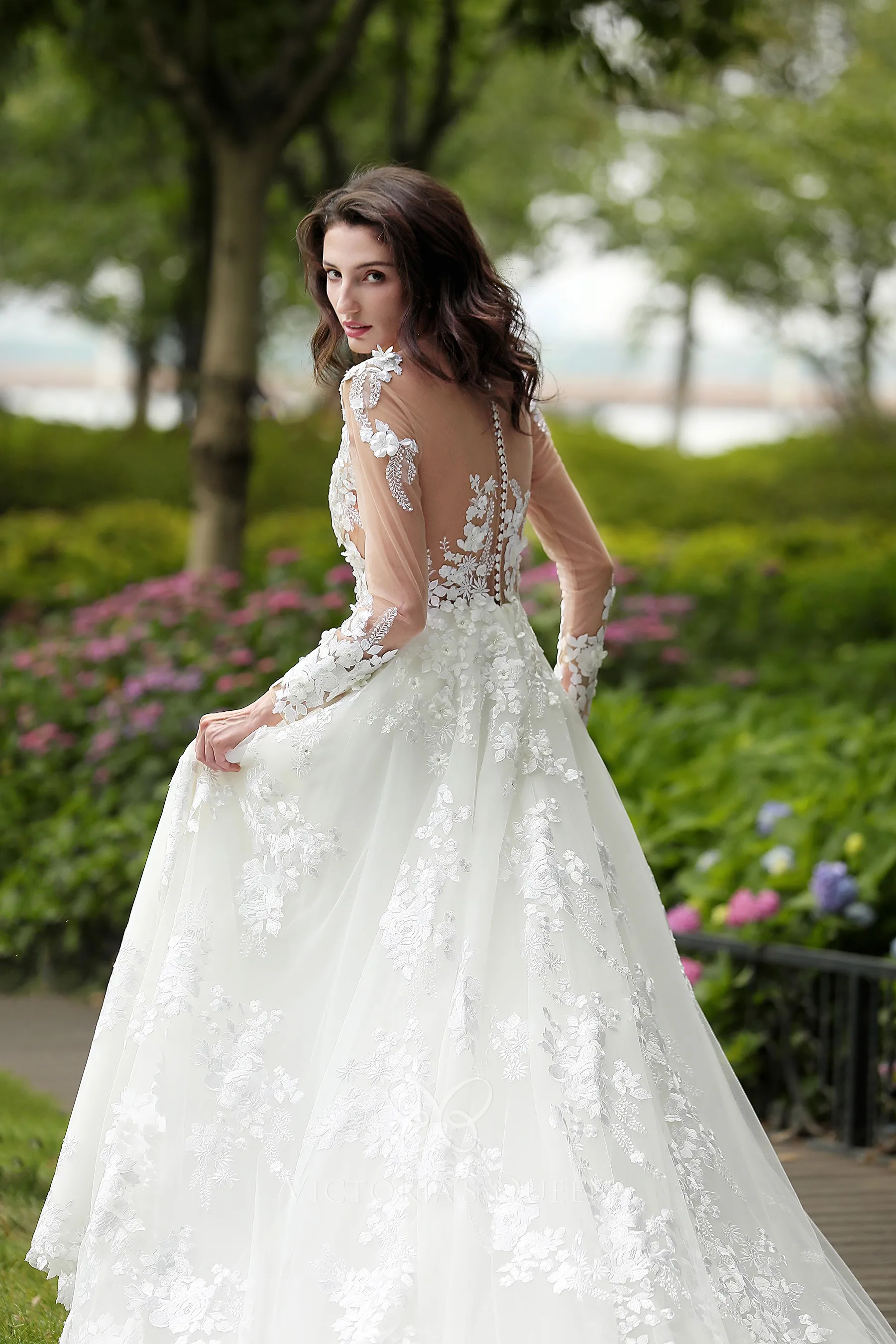 This romantic long-sleeved puffy destination bridal dress features a sexy illusion plunge bodice accented with frosted embroidered 3D lace flower appliques, a sheer back decorated with satin button closure, and a court train to complete the classic look.
