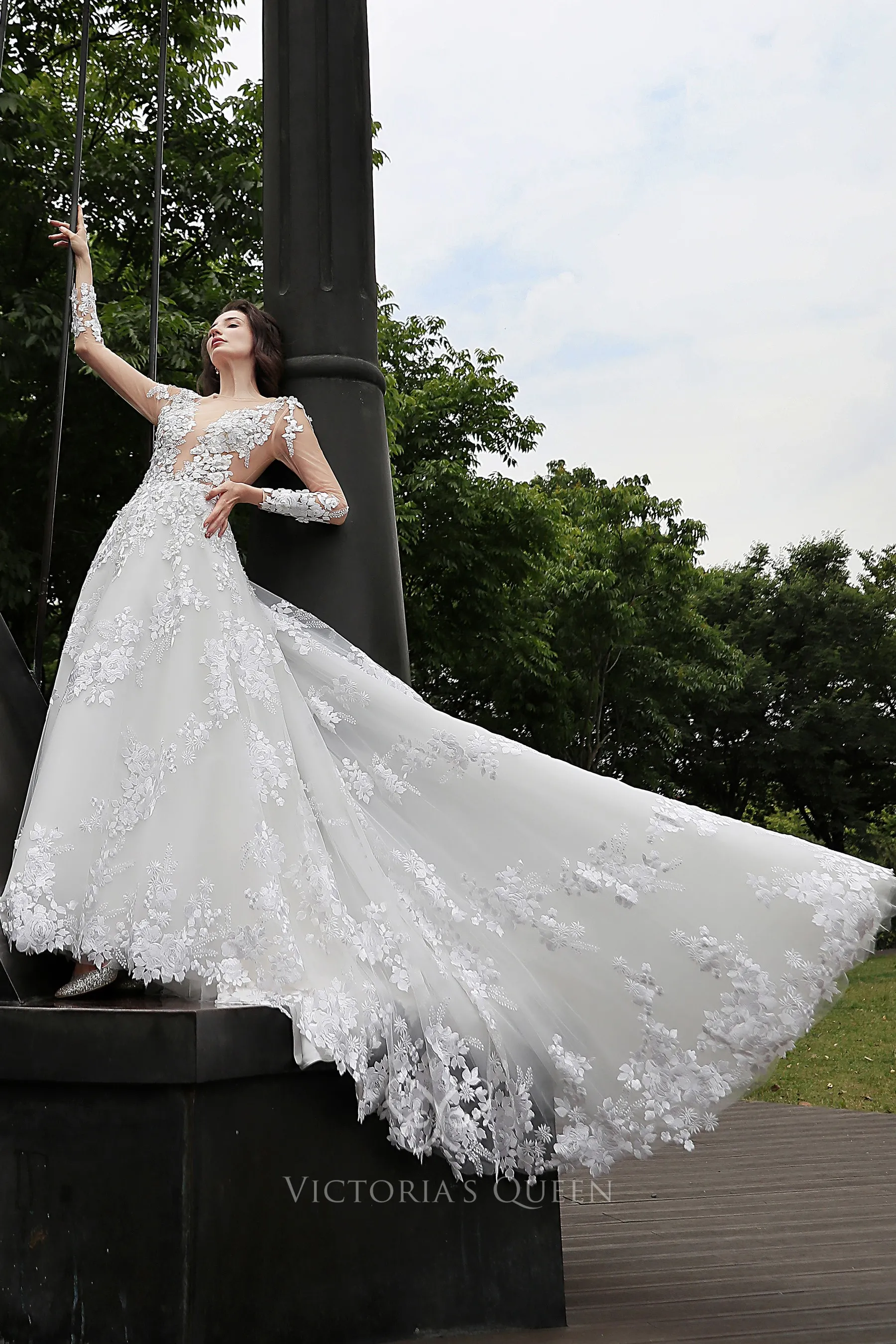 Romantic 3D Lace Flowers Long Sleeve Puffy Wedding Dress