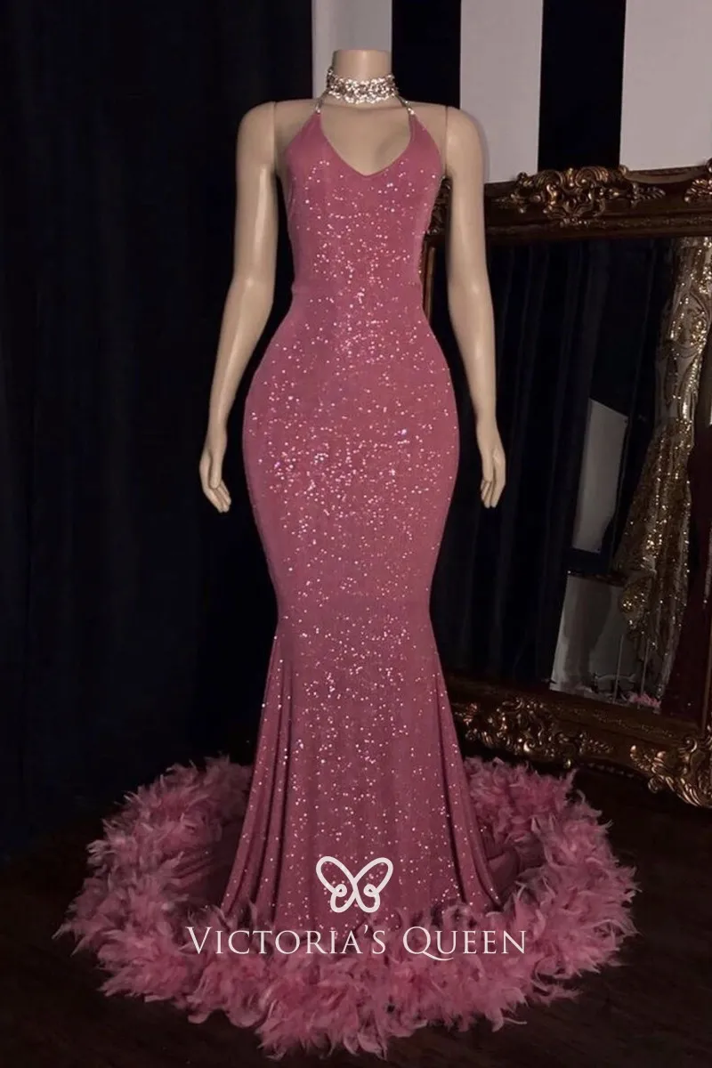 This amaranth glitter lurex mermaid gown is perfect for pageants or formal events. It features a halter V-shaped neckline with sparkling glitter straps and a fitted bodice that flares out dramatically at the knees. The unique long train is beautifully trimmed with luxurious ostrich feathers, adding an extra touch of glamour. This prom evening dress promises to make a striking impression with its elegant and bold design.