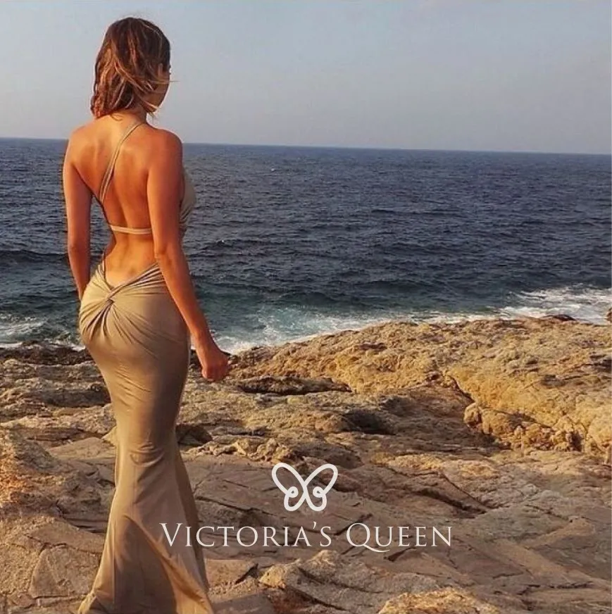 Sexy backless beige nude jersey slim-fit flattering mermaid long evening or bridal shower party dress with single shoulder straps. No train.