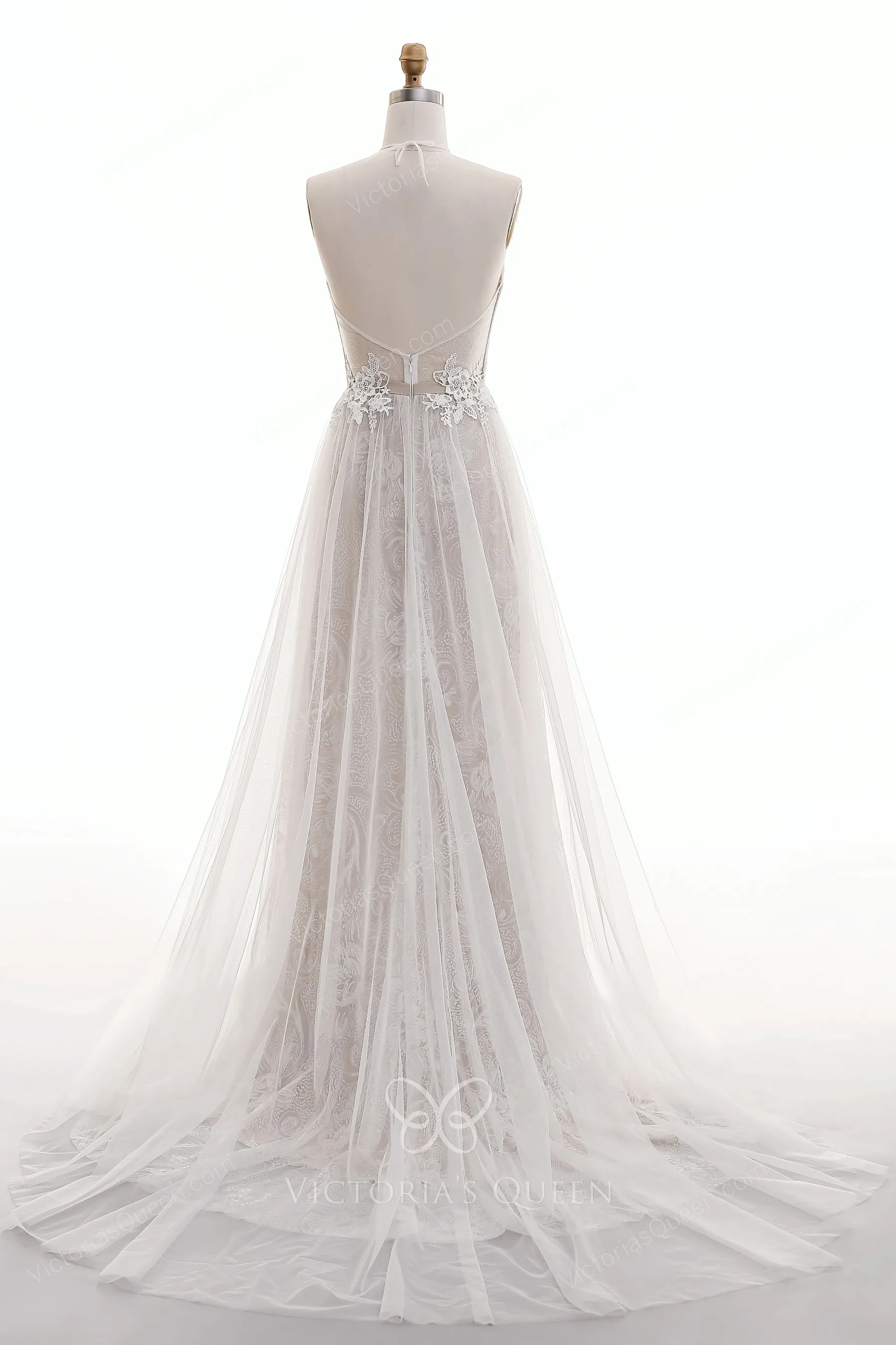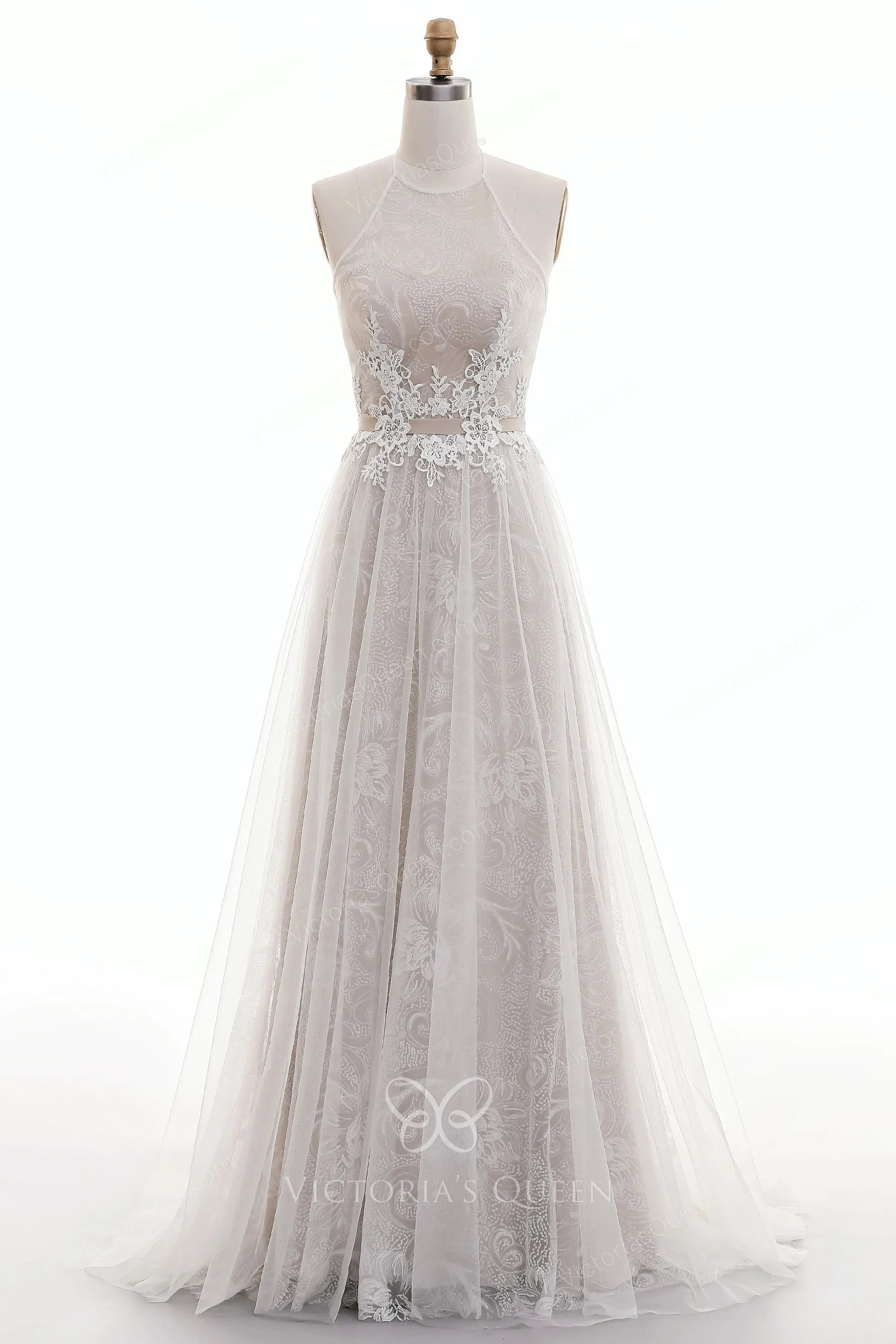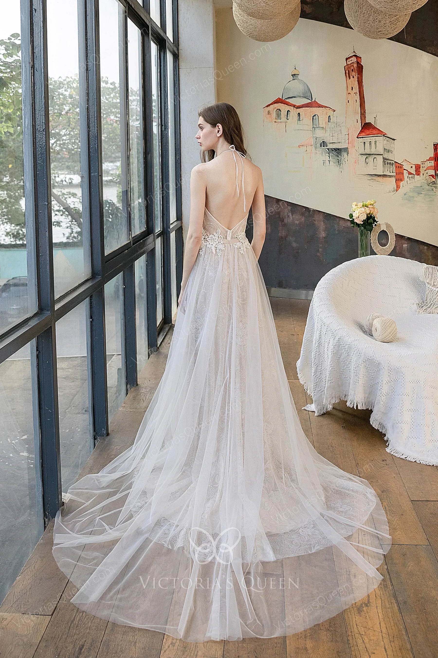 Modern beige nude halter backless A-line long summer destination bridal dress made of fantasy pattern shiny sequin lace, soft tulle overlay, and delicate floral lace appliques adorned on fine waistband.