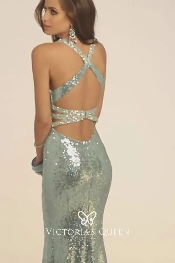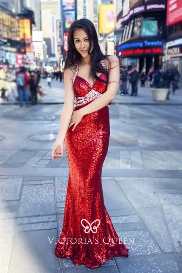 Sparkly red sequin slim fit mermaid floor-length long prom, evening, or pageant gown with silver beaded straps. Deep sweetheart bodice. Open back.