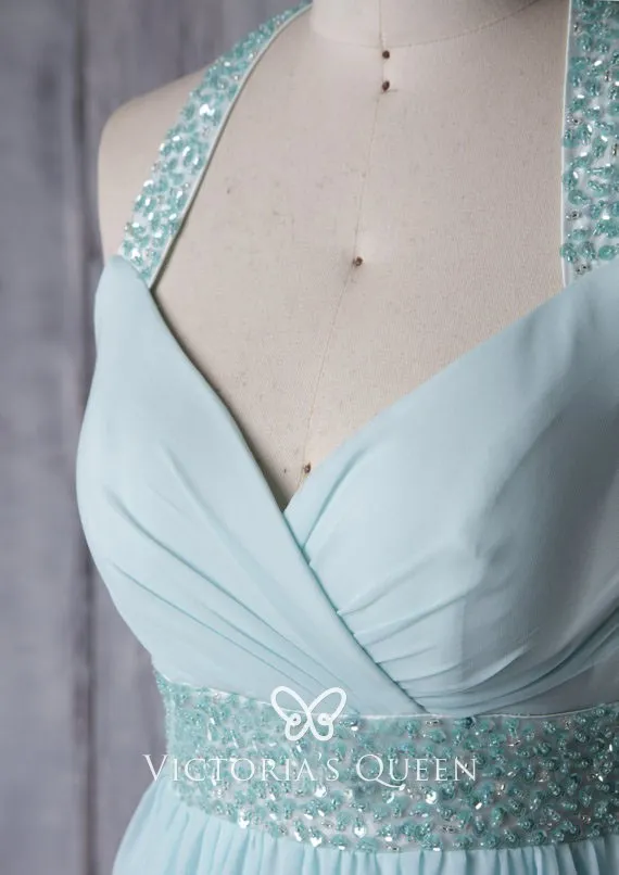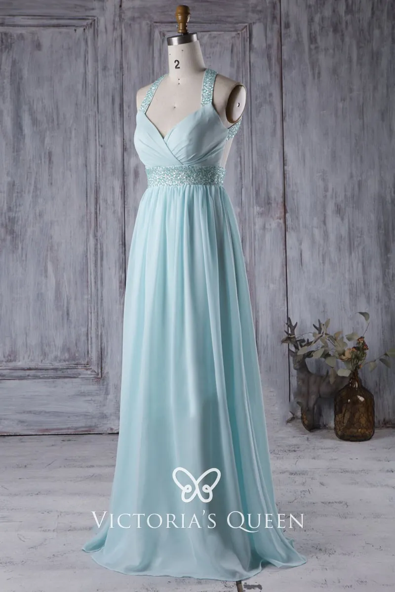 Beaded Straps and Belt Blue Chiffon Bridesmaid Dress