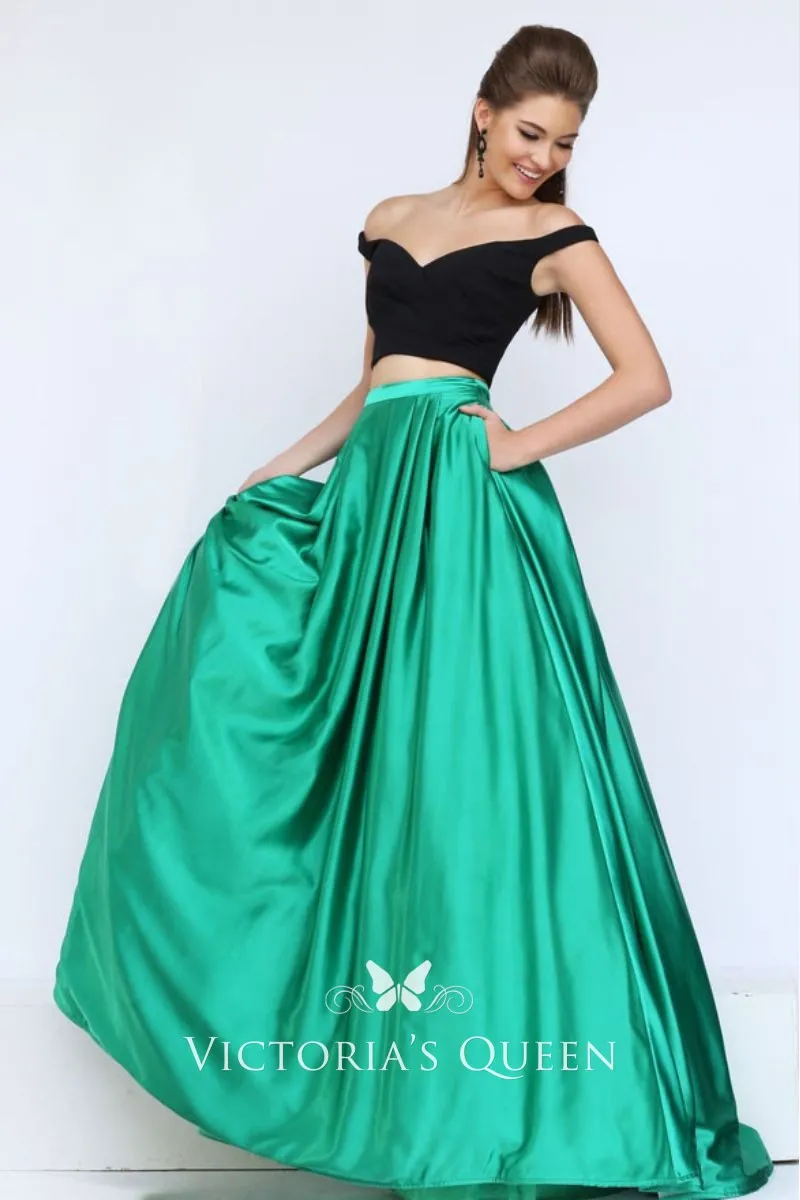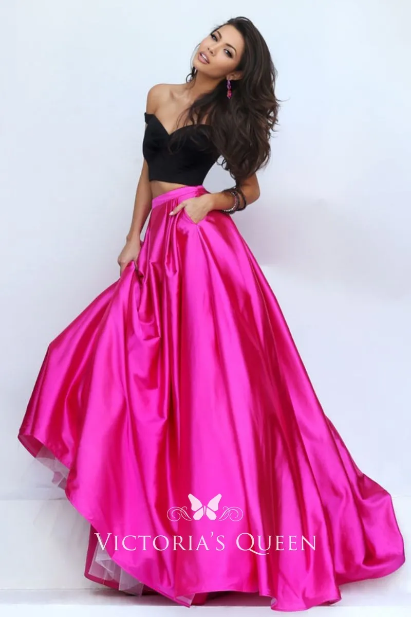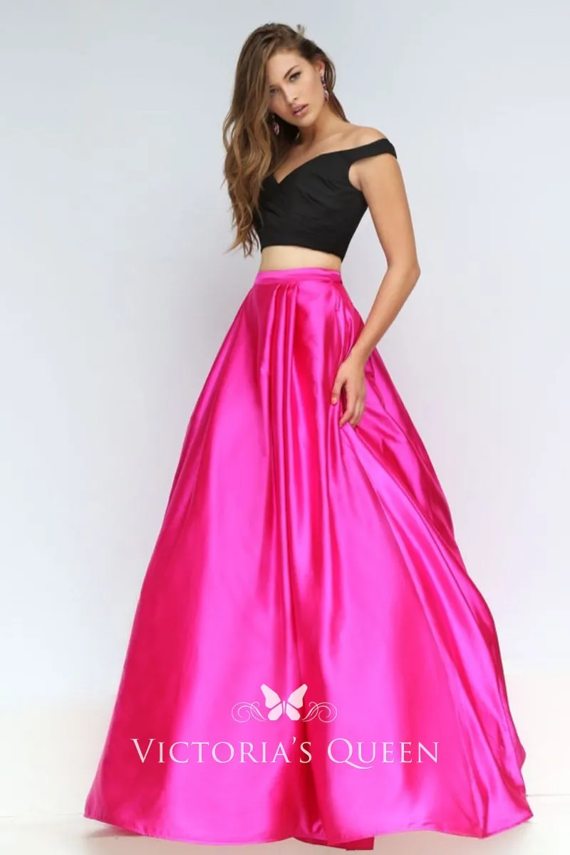 A black crop top with a fuchsia satin ball gown skirt completes this eye-catching two-piece two-tone prom, evening, or graduation dress. Off-the-shoulder bodice with wide open V-neck, bare at waist falls to floor length puffy skirt hem with pocket.