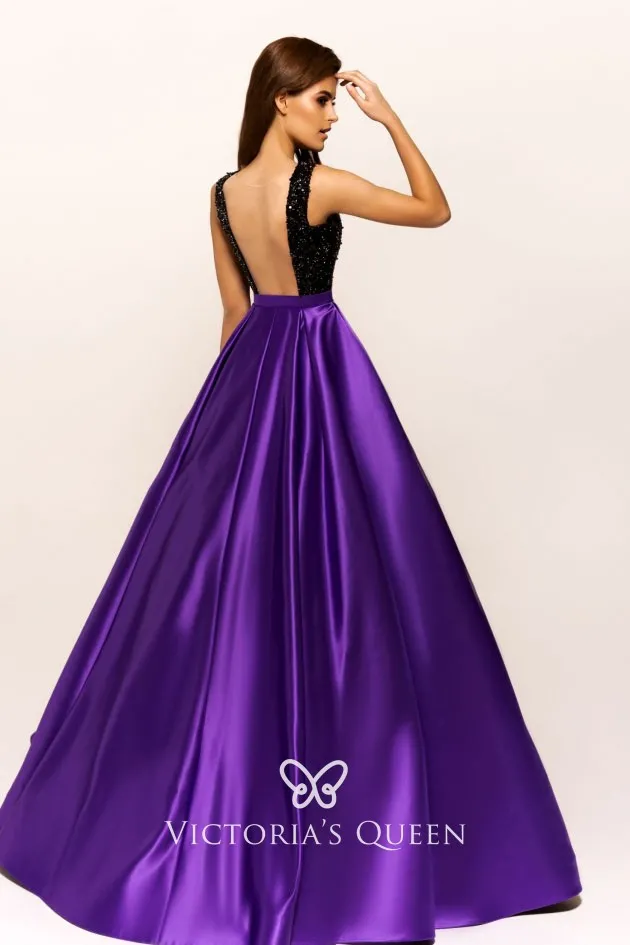 This two-tone sleeveless ball gown prom, evening, or wedding guest dress is characterized by a sparkling black sequin top with an illusion back, a timeless hot pink ball gown silhouette, and a lustrous satin skirt.