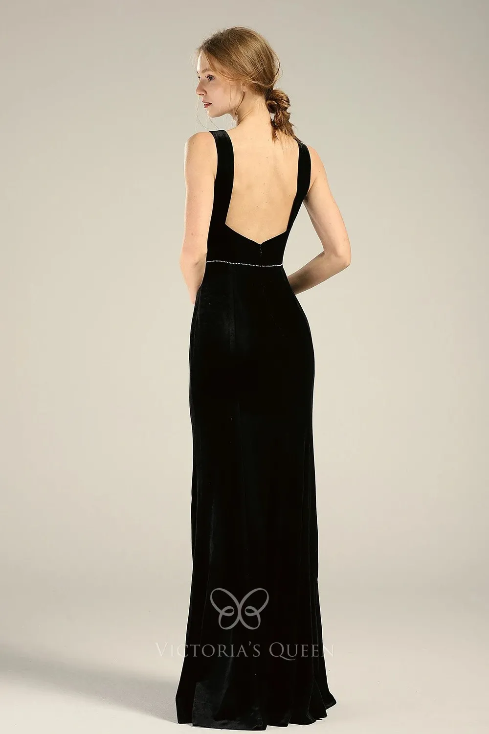 Modern black velvet boat neck sleeveless long sheath bridesmaid dress, low back with wide straps black velvet floor length evening or wedding guest dress.