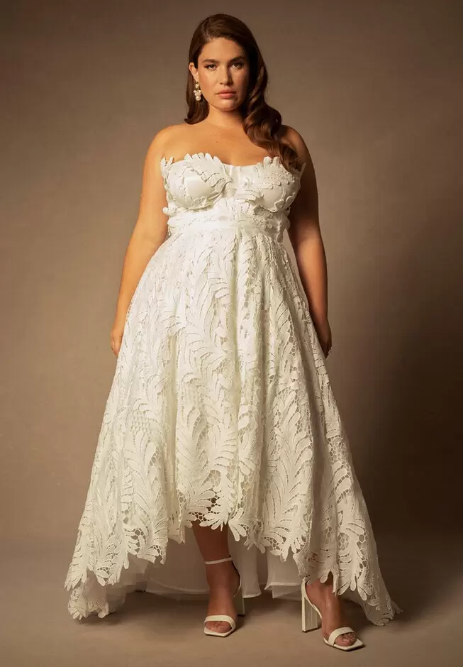 The classic A-line dress is always in style, offering a flattering, universally loved silhouette that’s perfect for curvy brides. The fitted bodice and gently flared skirt create a balanced, flattering shape. Fabrics like chiffon or organza add a light, flowing feel, making it ideal for both romantic indoor weddings and outdoor ceremonies. A sweetheart or V-neckline can draw attention upward, and adding a statement necklace can complete the look with a touch of sparkle.