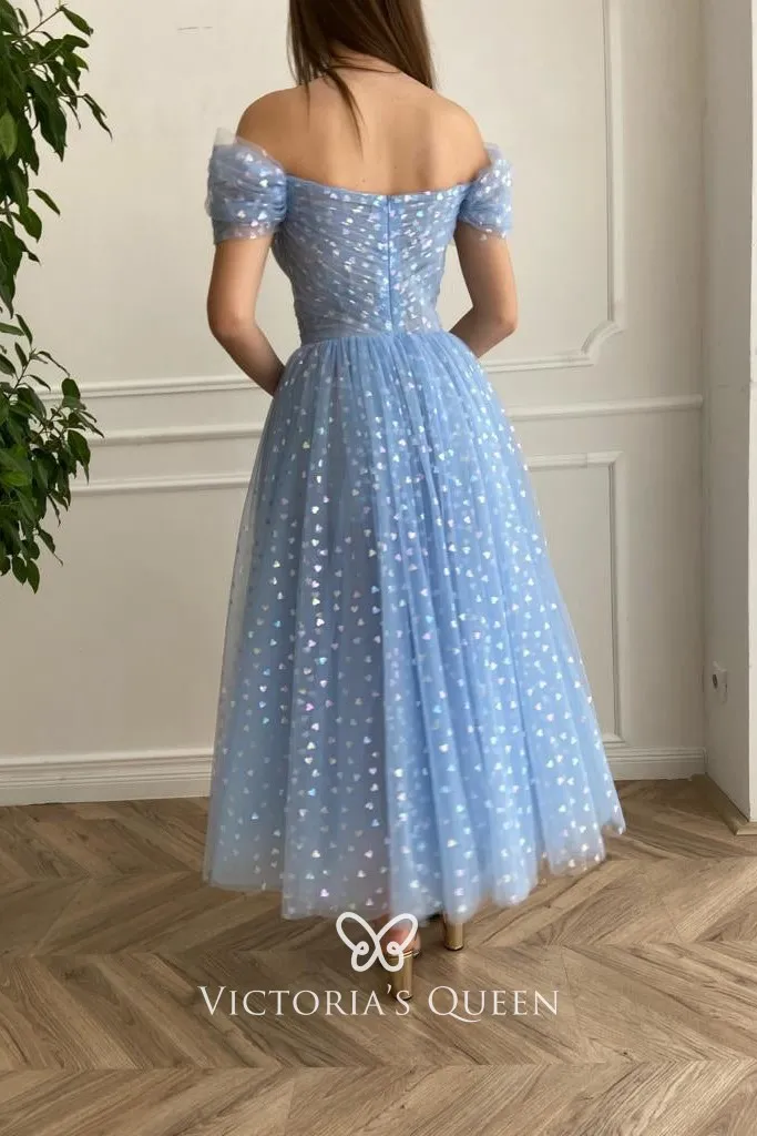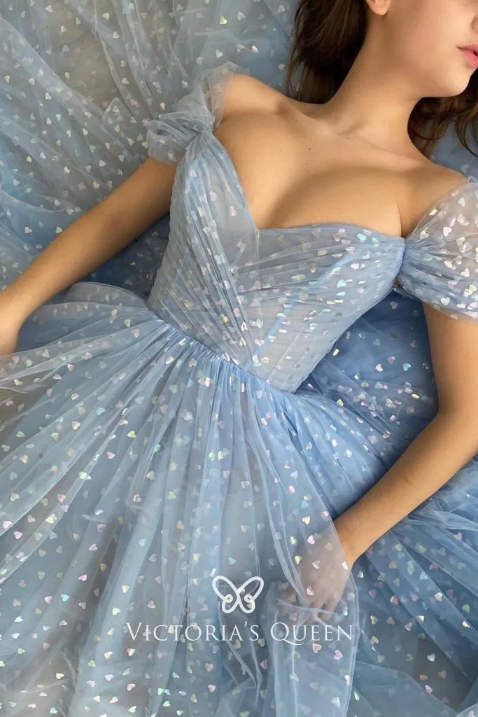 Fancy and cute blue glitter heart tulle ankle length cute semi-formal birthday party, graduation, or homecoming dress with pleated off-the-shoulder straps, V neckline criss-cross ruched bodice, and flowy A-line skirt.