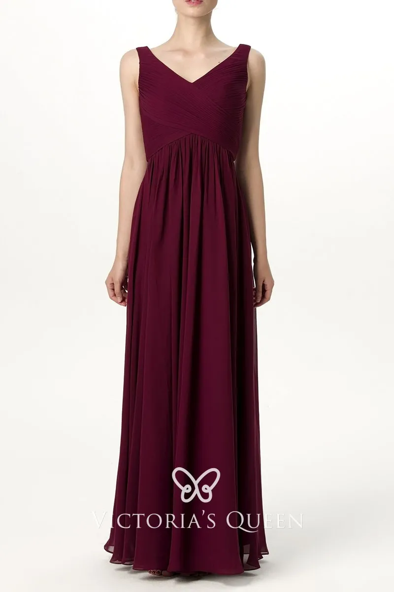 Dark Burgundy Chiffon V-neck Long Bridesmaid Dress