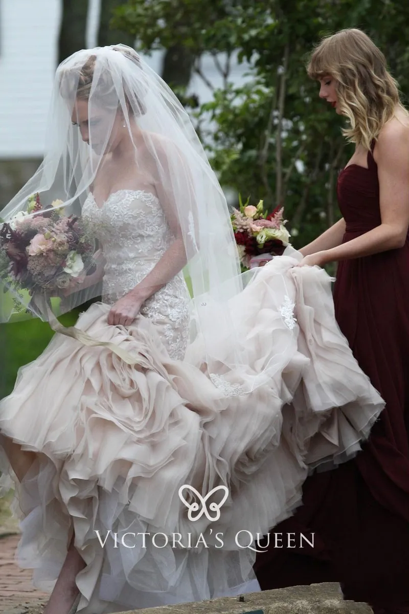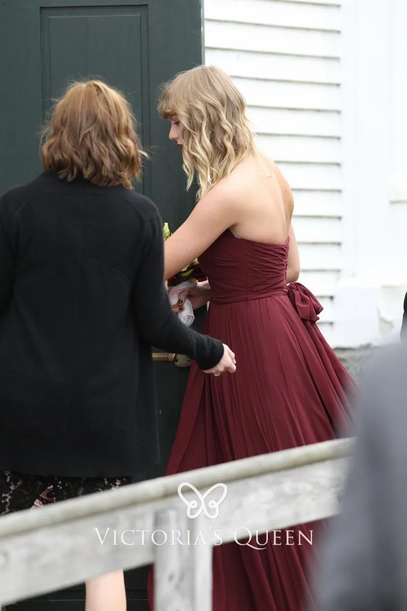 Taylor Swift's burgundy floor-length bridesmaid dress in her best friend - Abigail's wedding ceremony. Burgundy chiffon sweetheart long prom evening dress with spaghetti halter strap.