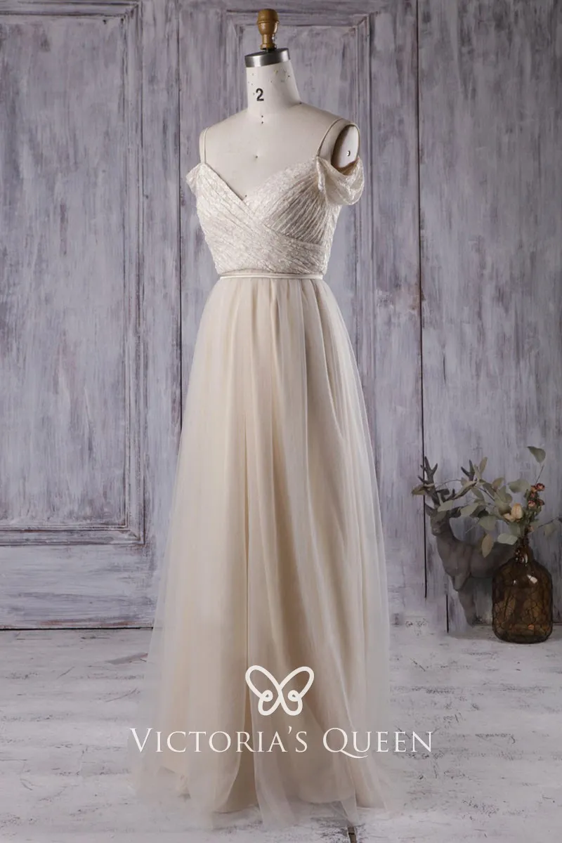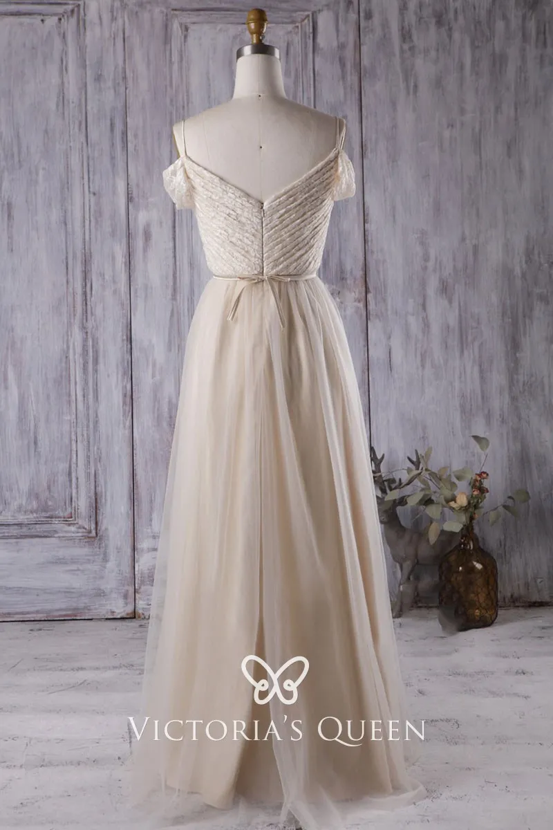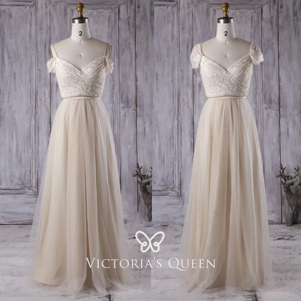 Romantic light champagne lace and satin A-line long bridesmaid or prom evening dress with tulle overlay. This A-line long gown features a ruched V-neck lace bodice with a convertible cap sleeve or off-the-shoulder sleeve. Low V back.