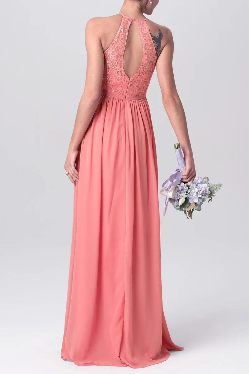 Coral Lace and Chiffon Cute Halter Long Bridesmaid Gown