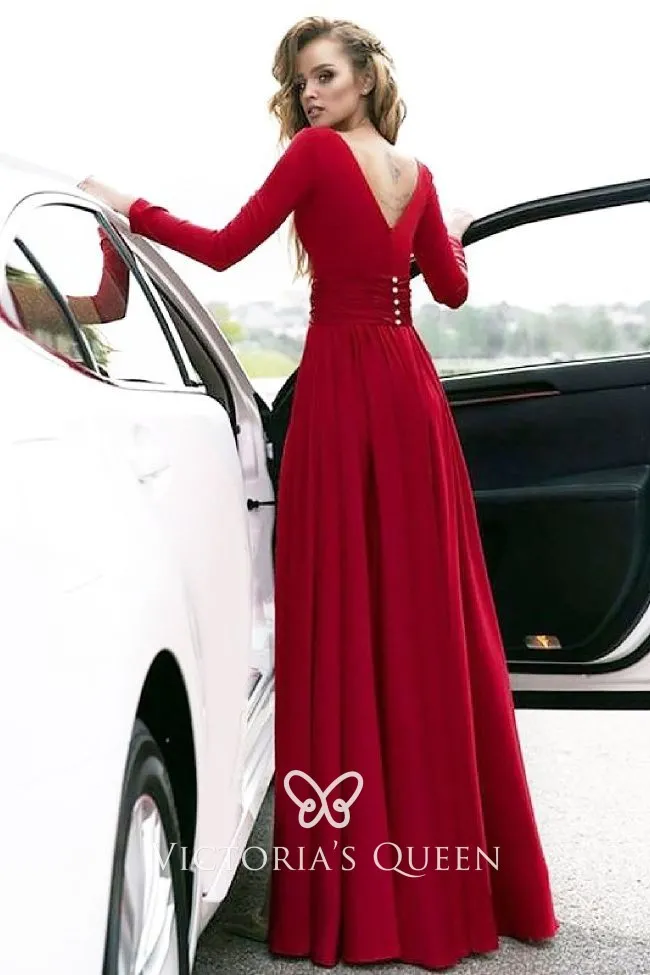 Cool & sexy crimson red satin chiffon A-line floor-length long prom, evening, or military ball dress with curved plunging V neckline, long sleeves, and thigh-high slit.