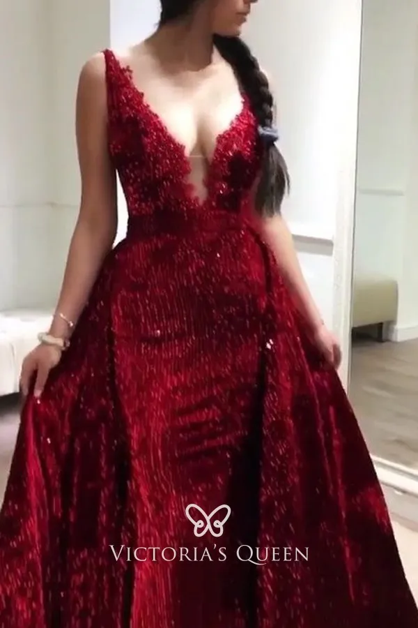 Be IG-ready and rock this sparkly dark red sequin prom evening dress that features a lace-appliqued plunging neckline, a sheath silhouette skirt, and a unique floor-length overskirt.