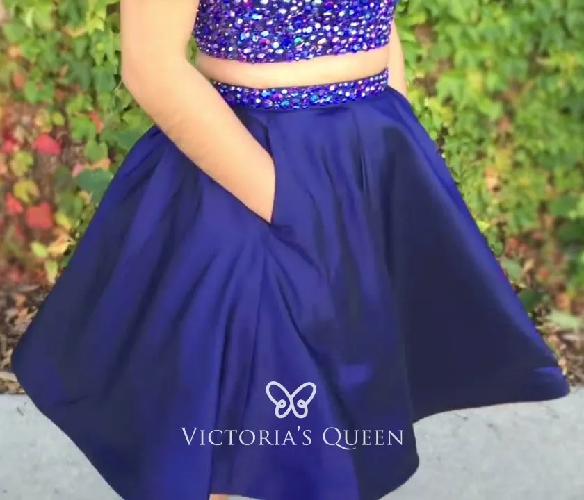 Unique bluish purple diamond crop top two-piece short satin prom, birthday or cocktail party dress with pockets. Sleeveless. High neckline. Short A-line skirt. Keyhole back.