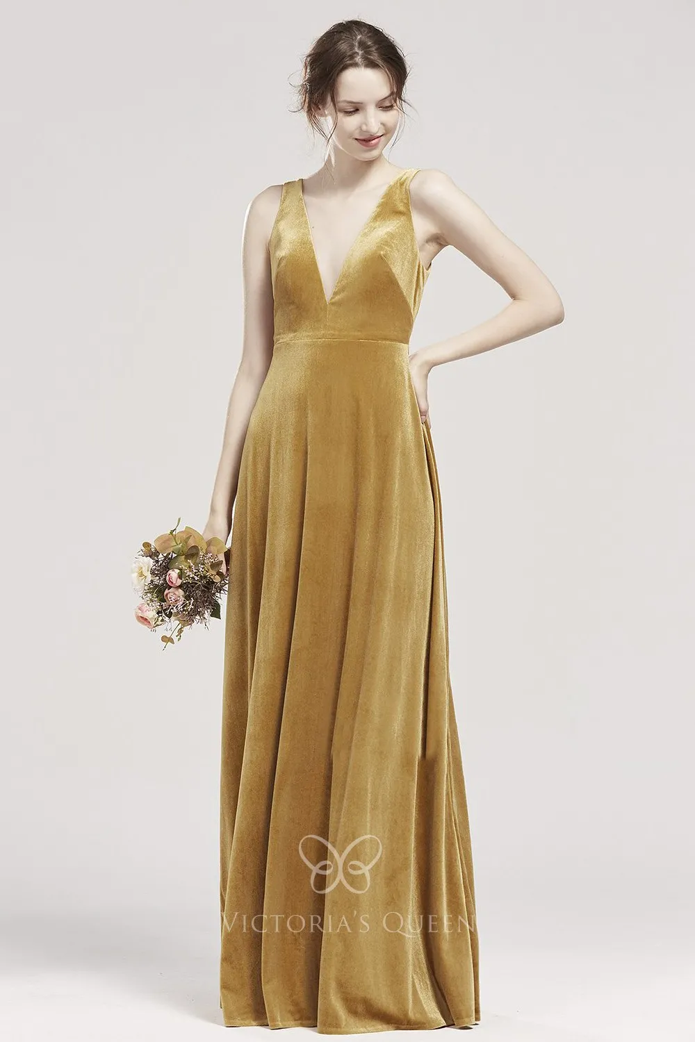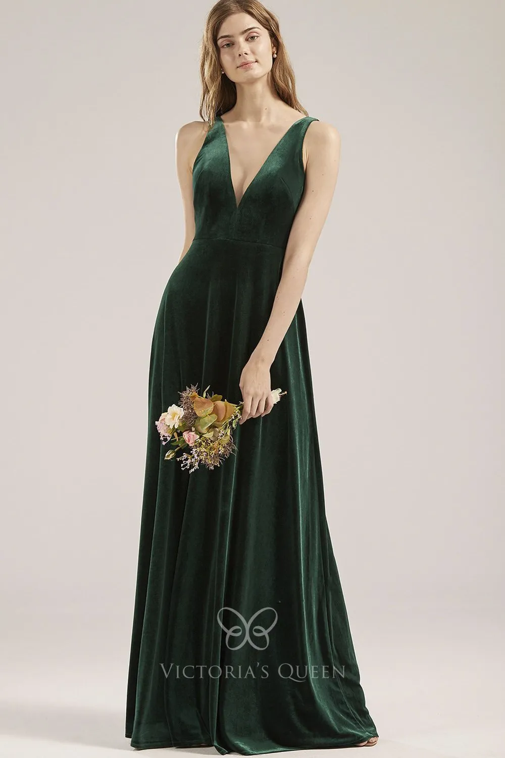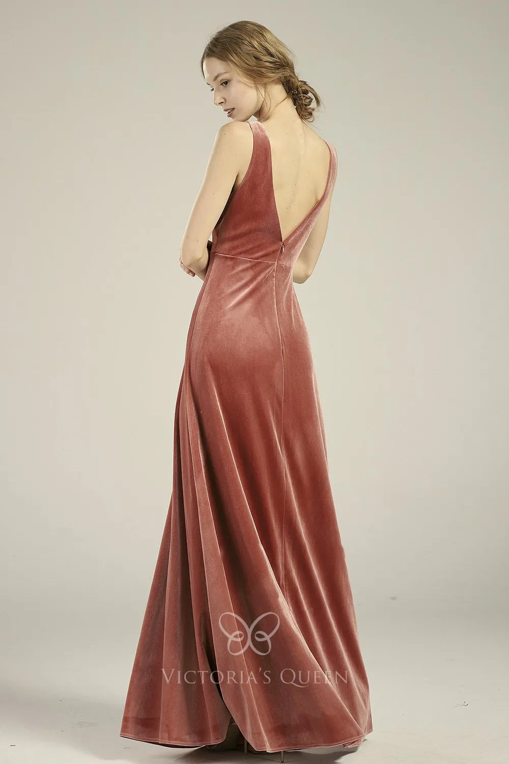Plunging V Neck English Rose Velvet Simple Bridesmaid Dress