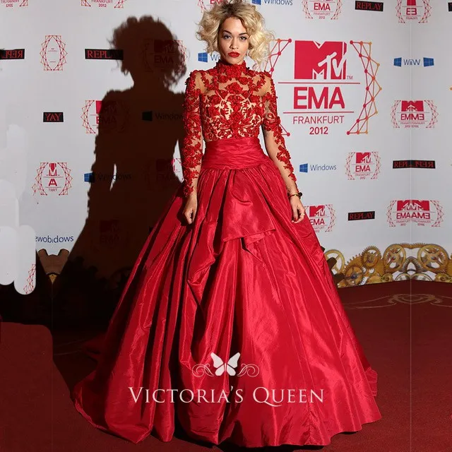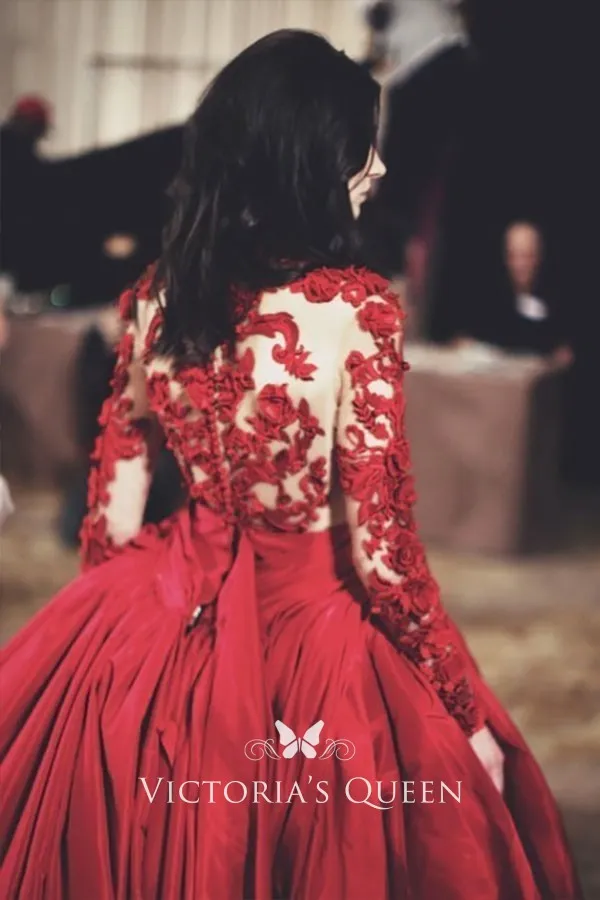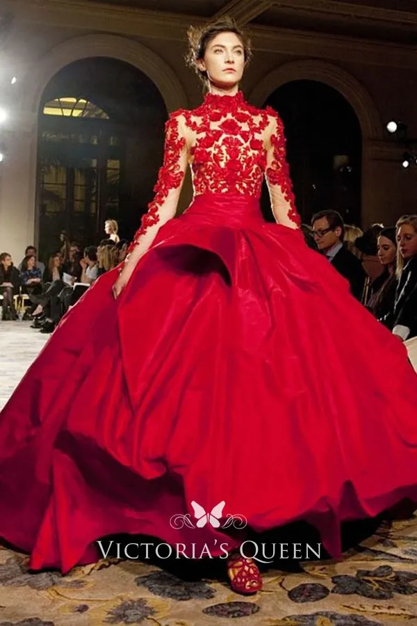 Modern floral red lace and satin celebrity prom gown. Illusion high-neck and long sleeves on a red satin ball gown for the red carpet, the best choice for any event.
