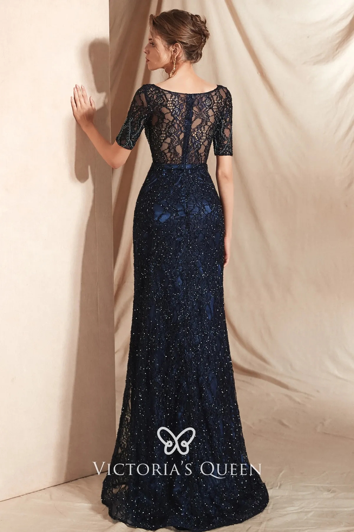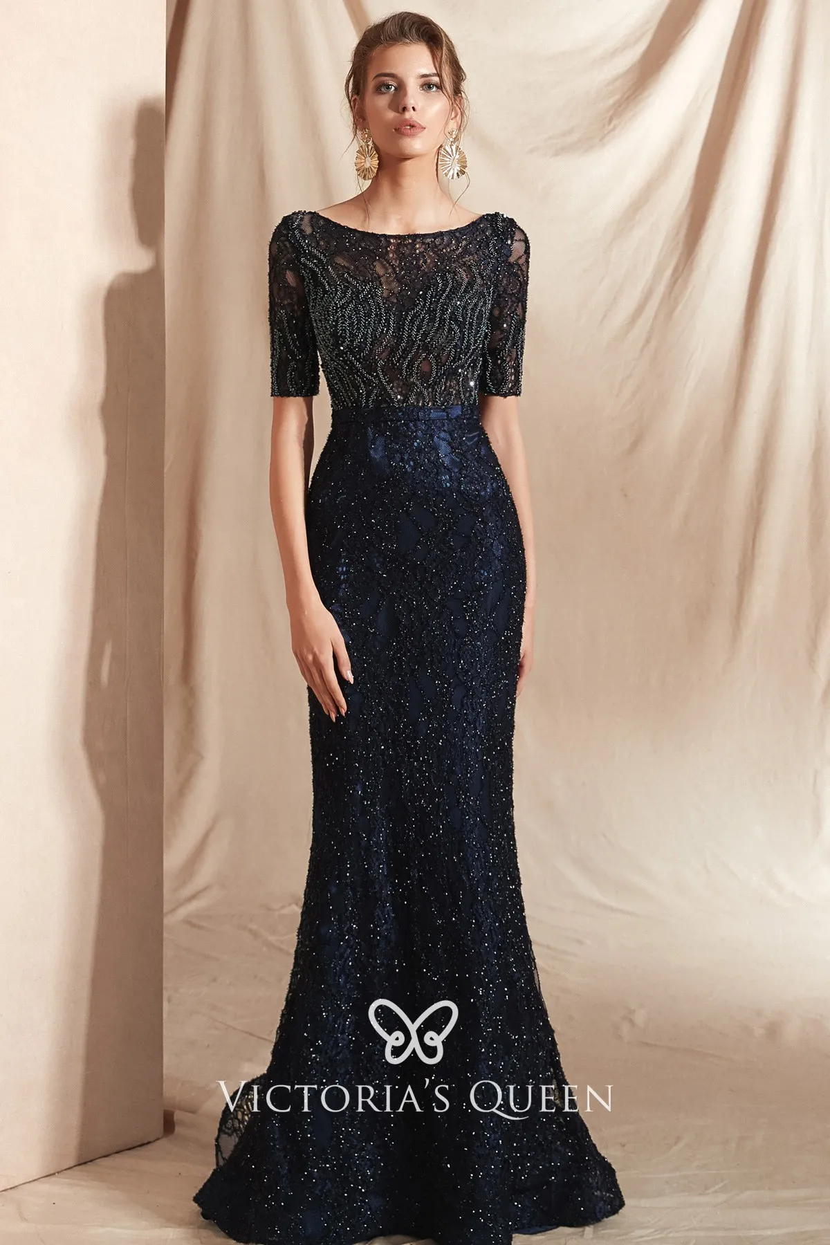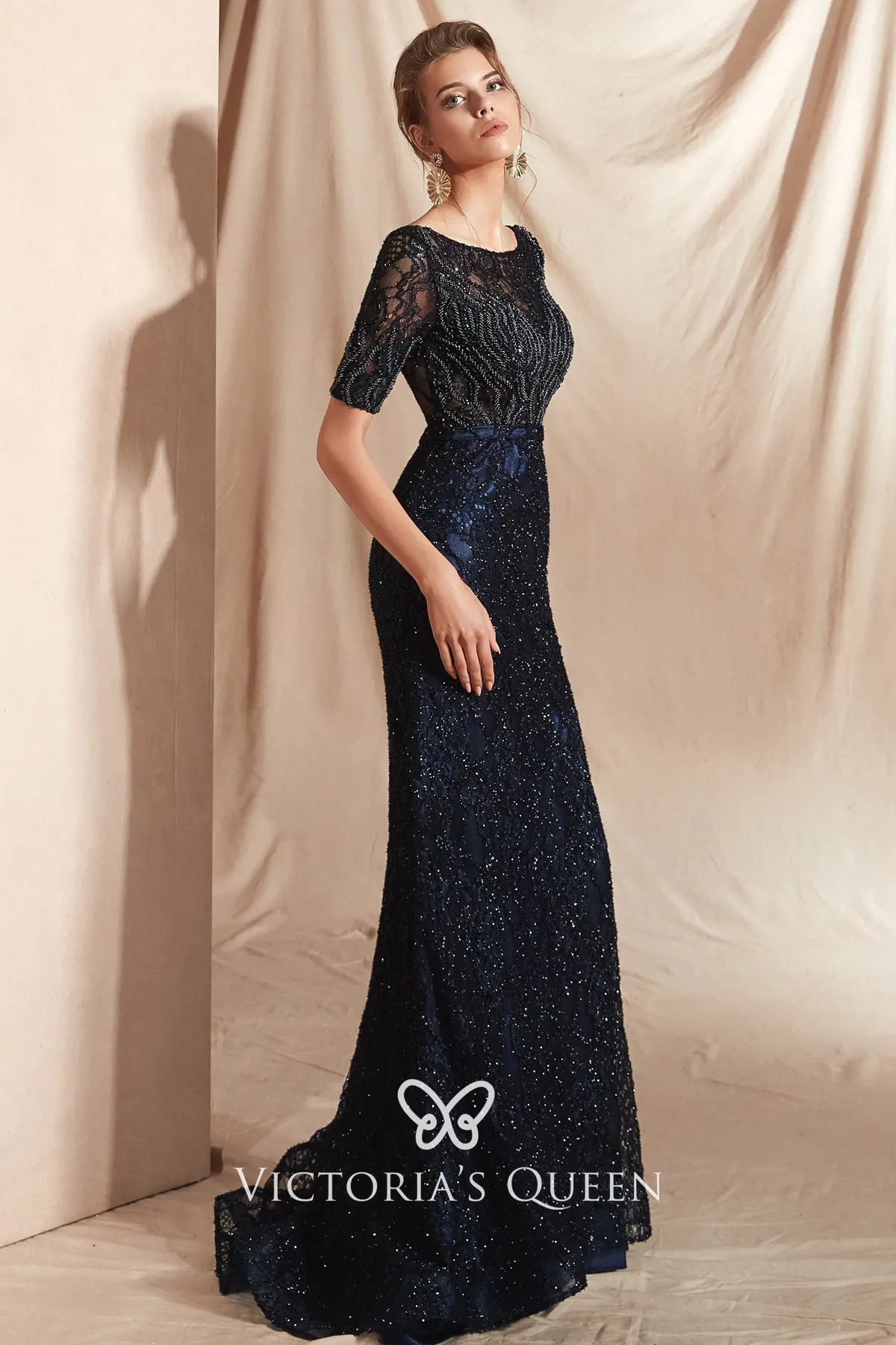 Elegant black glitter lace with beaded bodice long mermaid navy satin evening or wedding guest dress, sheer bodice with beaded stripes, boat neckline, and short sleeves. Zipper closure sheer illusion back.