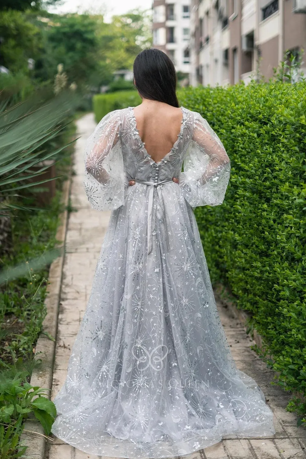 Glitter celestial star & moon patterns silver gray sequin glitter mesh layered evening formal gown. With a gray satin underlayer, this unique silver-gray starry glitter mesh A-line prom or anniversary gown features a deep V neckline, sheer long puff sleeves, and a V back.