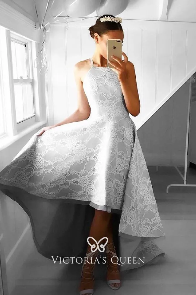 Gray Satin White Lace High-low Homecoming Prom Dress