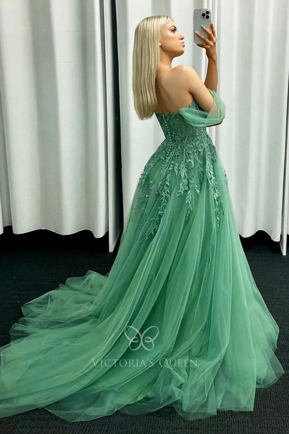 A captivating green lace and tulle A-line military ball dress, designed to turn heads at any prestigious event. The intricate illusion leaf lace appliqué corset bodice offers a delicate yet bold look and features a sweetheart neckline, and off-the-shoulder straps, and is paired with a flattering zipper back adorned with elegant button accents. Flowing effortlessly into a full tulle skirt, this floor-length masterpiece is perfect for proms, weddings, or any formal occasion where you want to shine with grace.