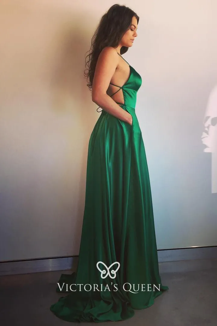 Modern green satin long prom, evening, graduation, or military ball dress with side slit and pockets. Scoop neckline with spaghetti straps that extend to the lower back.