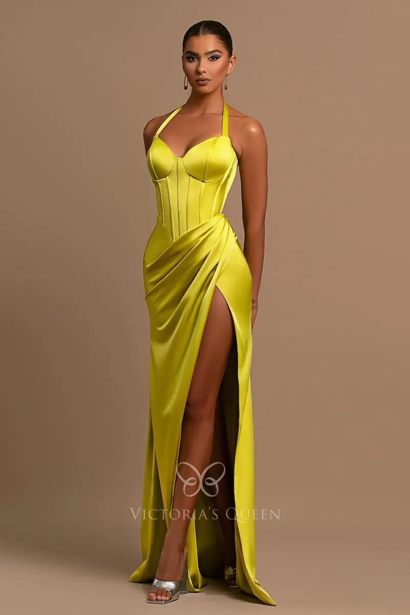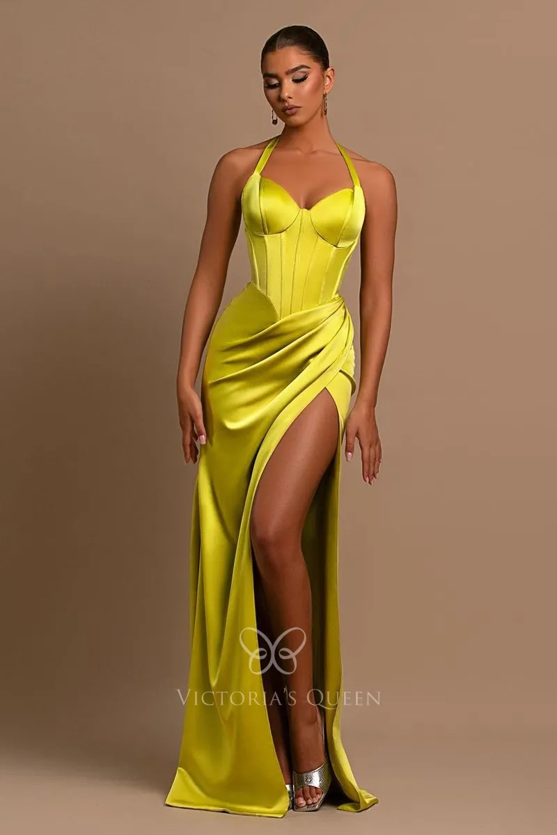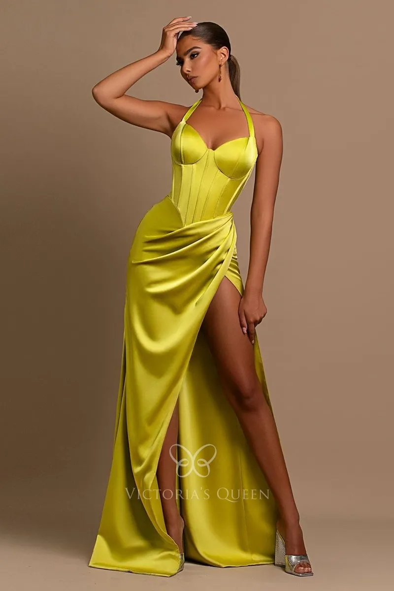 Modern Halter Corset Lime Yellow Satin Sheath Slit Prom Gown