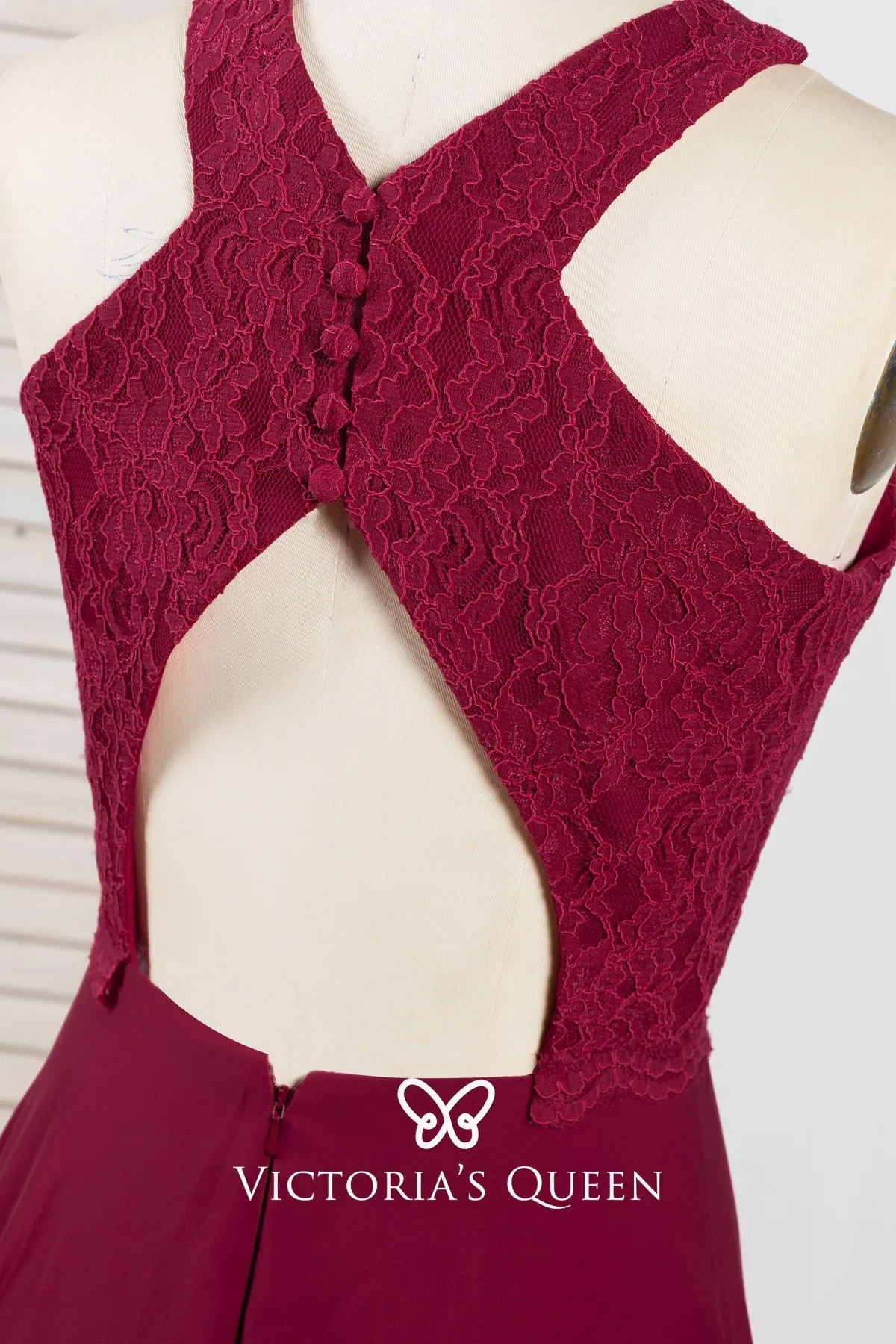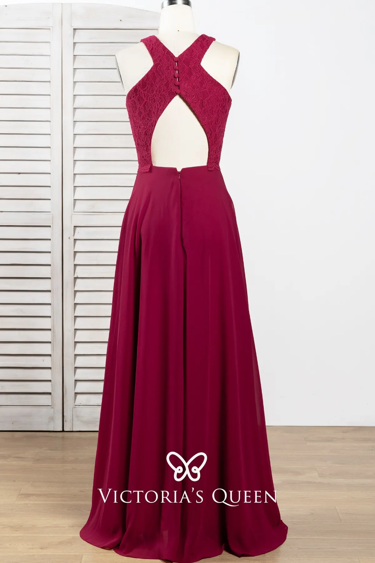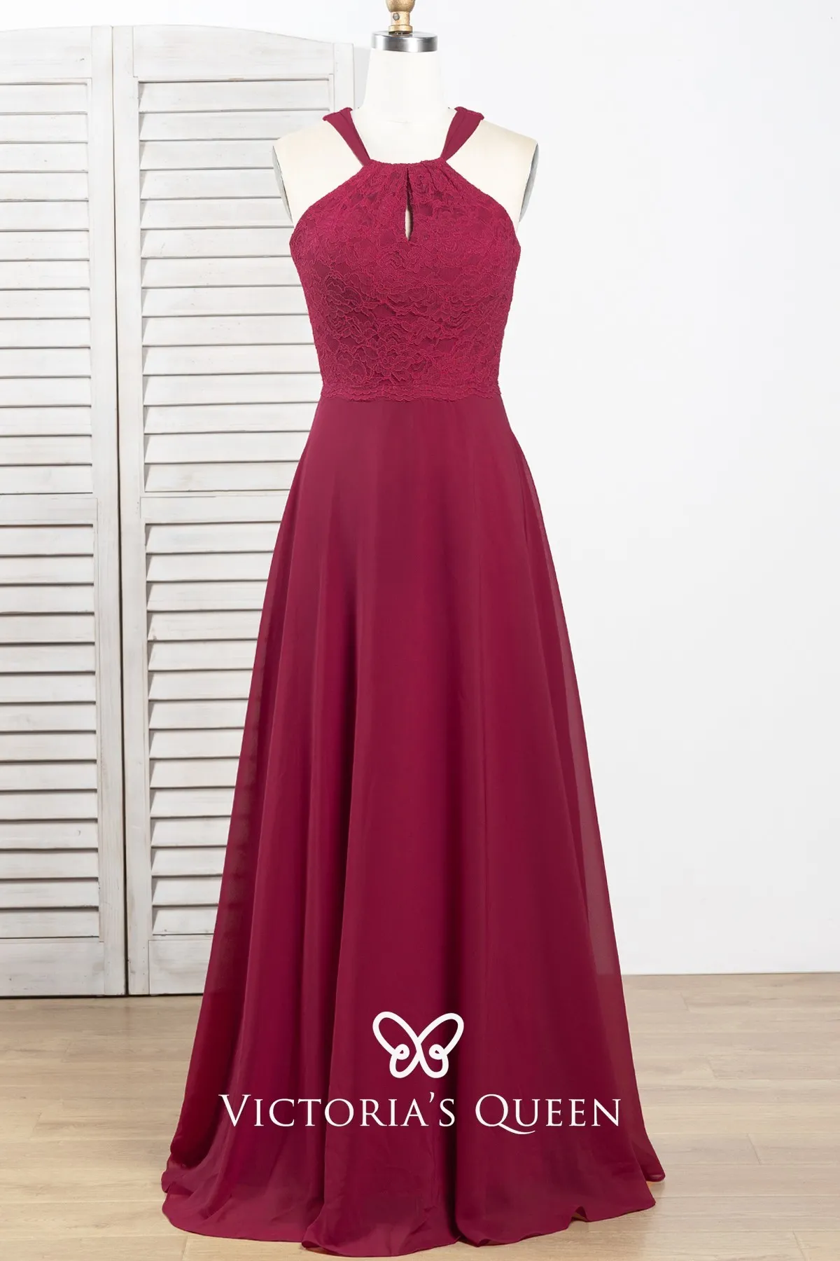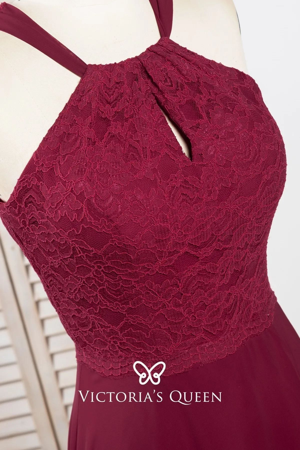 Fancy and elegant dark red lace and chiffon long bridesmaid, evening, or wedding guest dress with halter straps and keyhole bodice, A-line floor-length chiffon skirt, and open back.