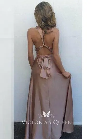 Featuring a demure halter design as well as a deep V-neckline, and classic empire waist, this lustrous sleeveless mauve satin A-line long prom, evening, graduation, or military ball dress will make you the eye-catcher without a doubt.