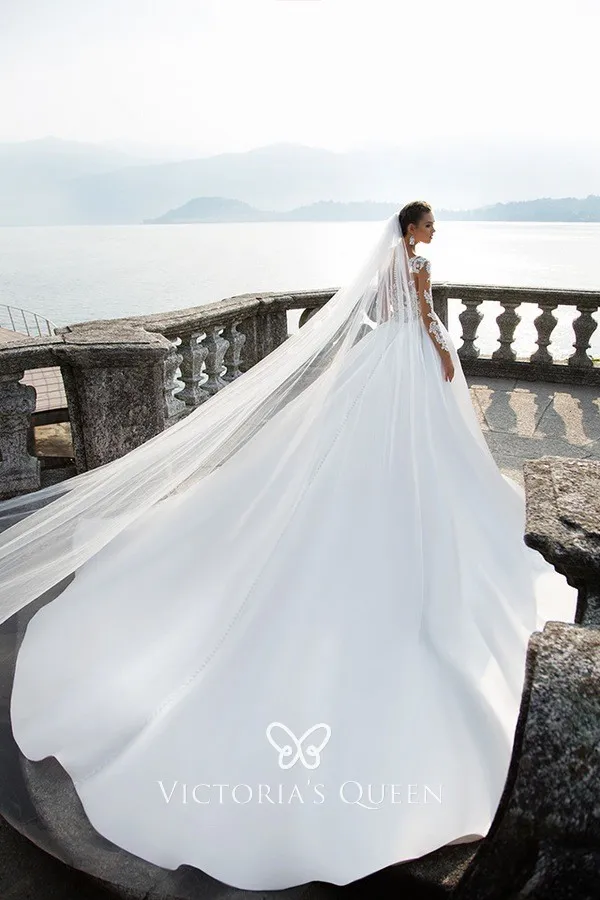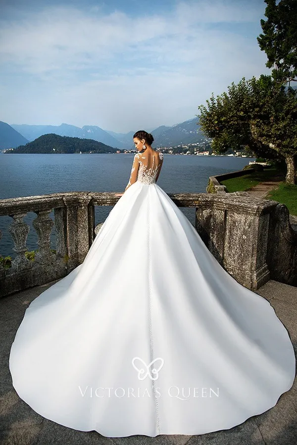 Illusion ivory lace and satin beach ball gown spring/fall elegant wedding dress. Illusion sweetheart neckline and long sleeves. Illusion lace back with button decoration. Cathedral train.