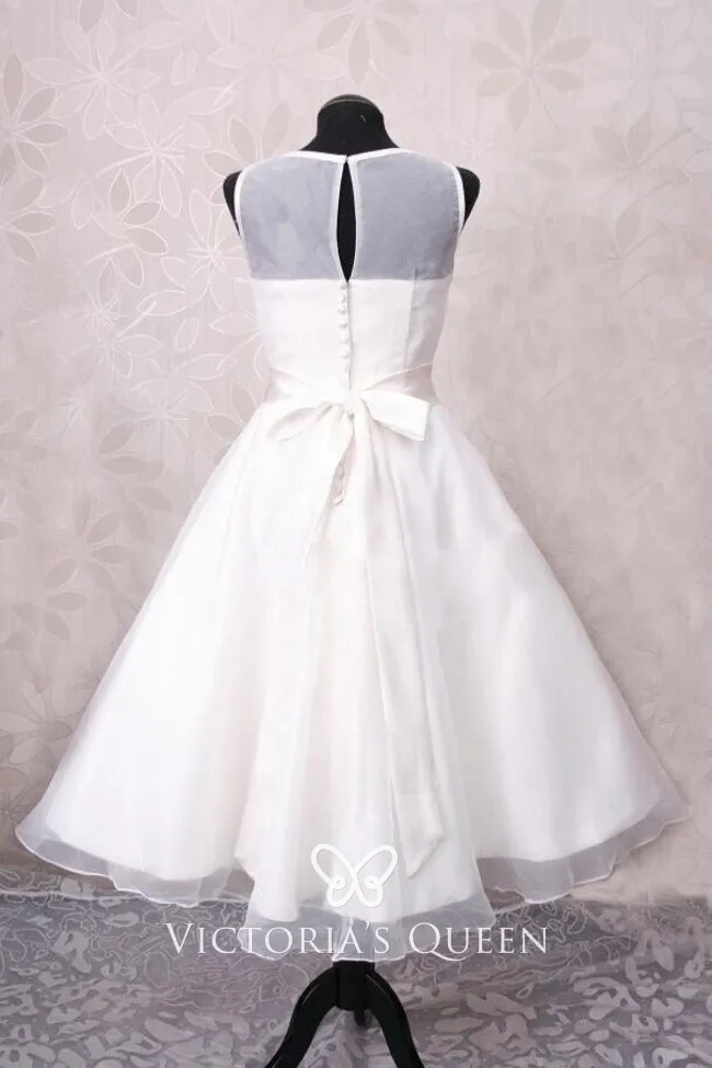 Ivory Organza Illusion Neckline Tea-length Wedding Gown