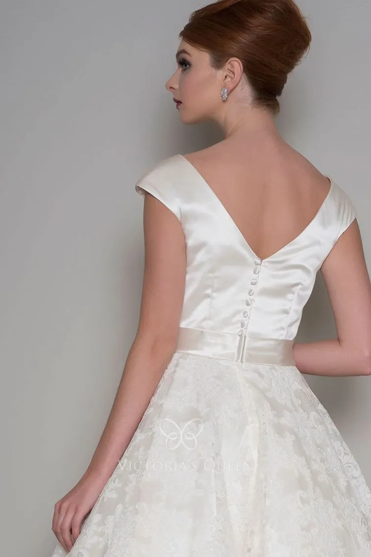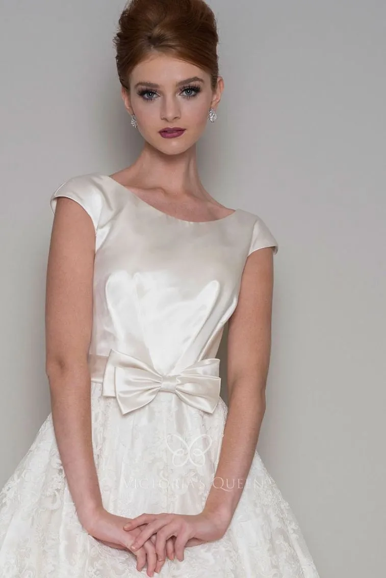 Cute A-line knee-length short spring/summer/fall wedding dress with circular corded lace skirt under the cap sleeves satin bodice, trimmed with a double bow belt V back with button closure.