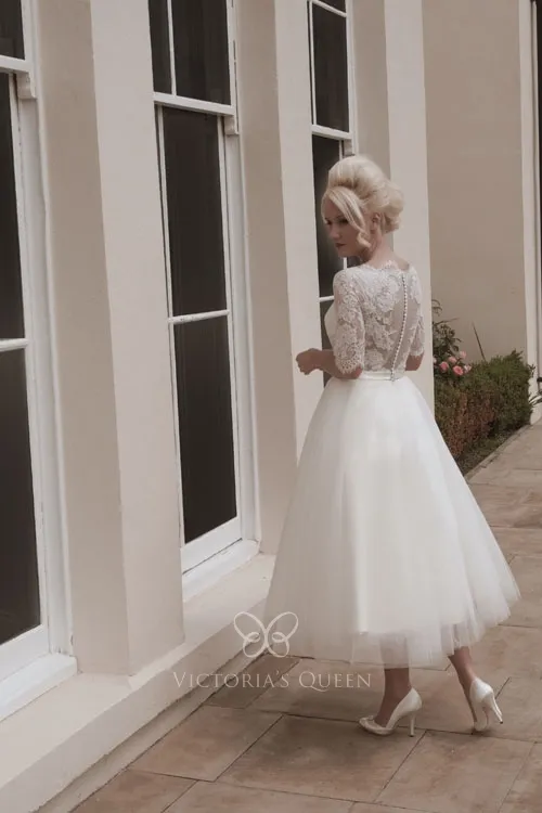 Ivory Lace Illusion Sleeve Tea Length Wedding Dress