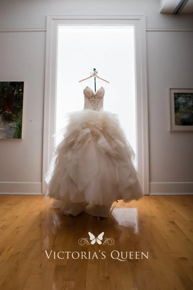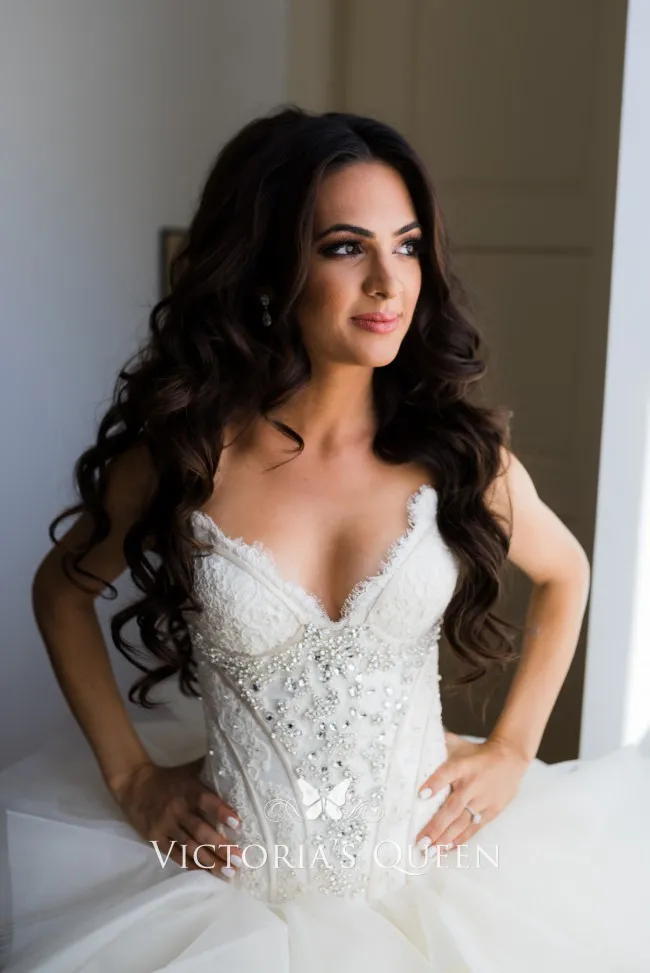 Princess spring/fall/winter bridal ball gown. Strapless V-neckline lace bodice highlighted with sparkly beaded crystals, puffy ball gown skirt with layered tulle adding dimension.