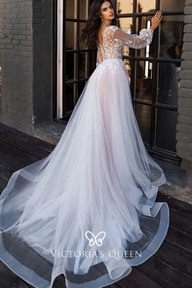 This elegant spring/fall boho destination wedding dress is the picture of effortless romanticism, featuring an ivory leaf lace appliqued plunging V neckline and puffy long sleeves bodice, V back with buttons decoration, and chapel train.