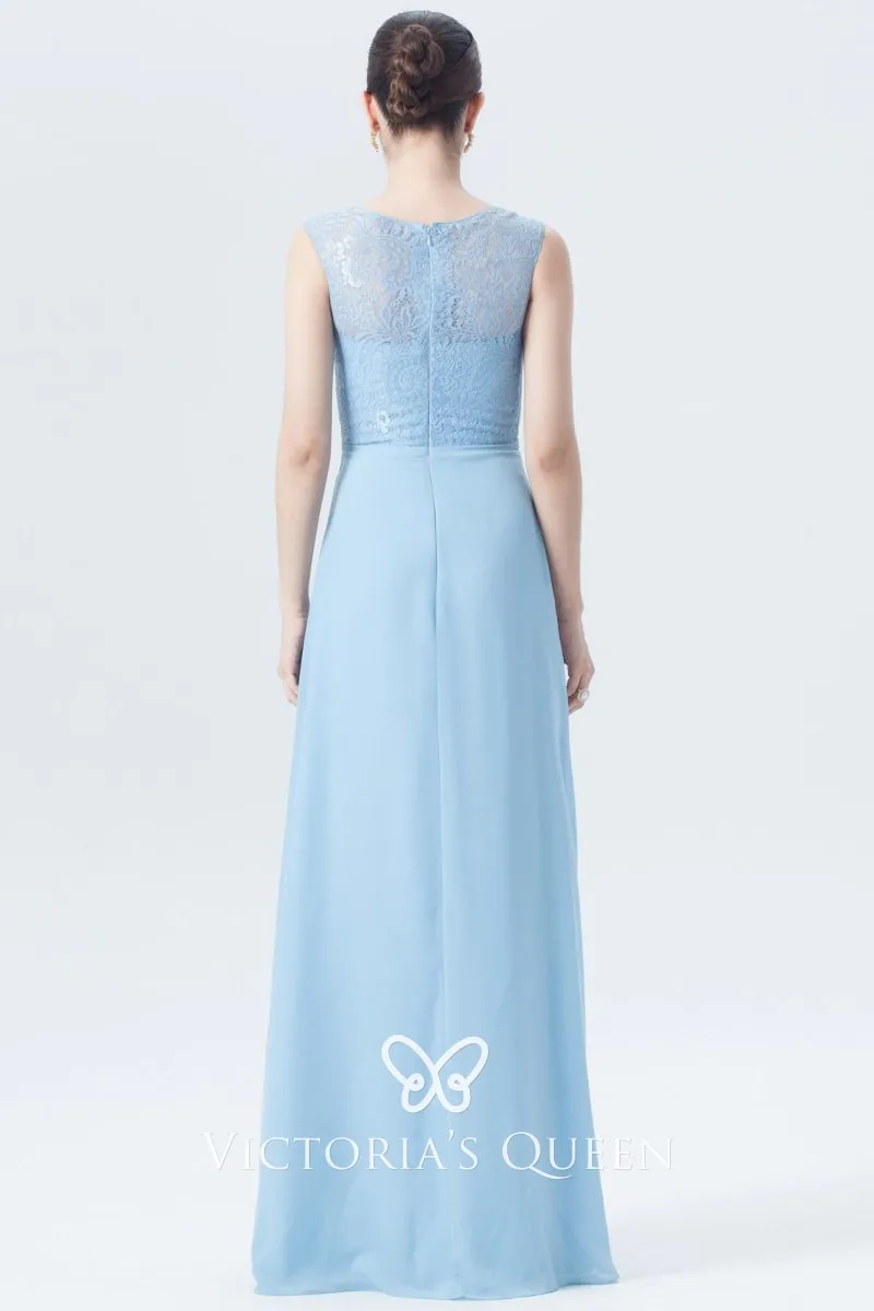 Light Blue Chiffon & Floral Lace Long Bridesmaid Dress