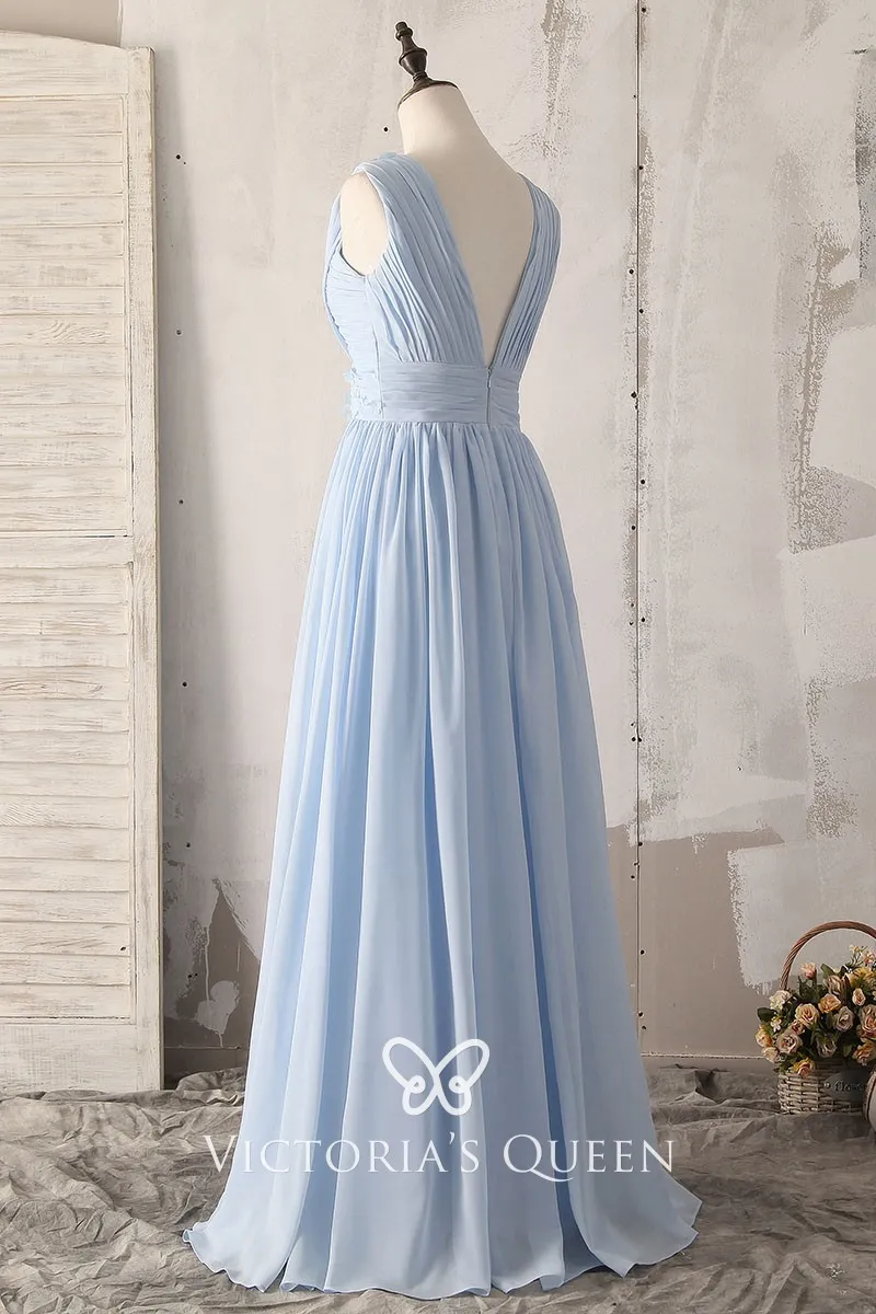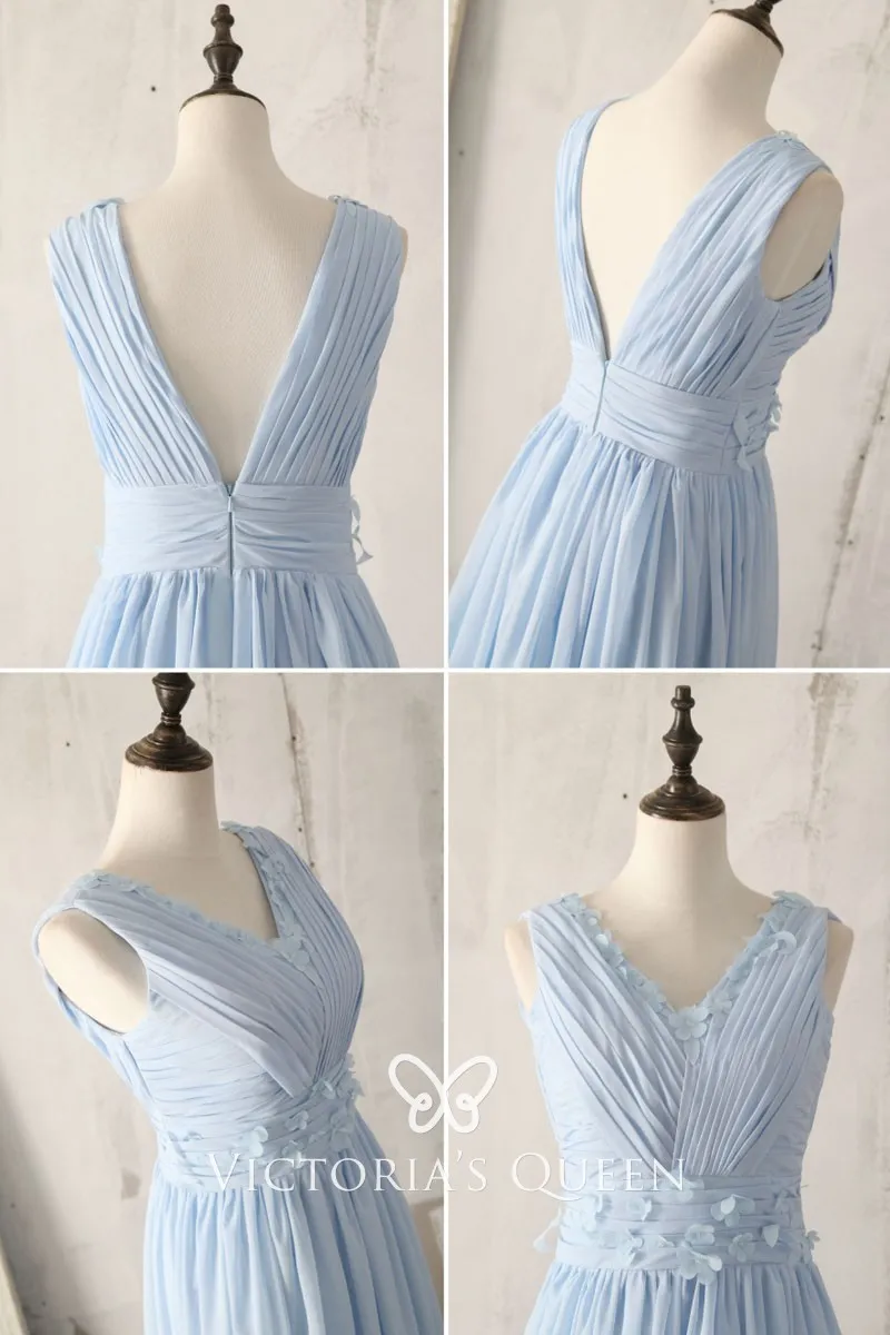 Light blue chiffon sleeveless bridesmaid, evening, or wedding guest dress. The pleated V-neck bodice with a ruched belt features romantic petals decorations and floor length skirt shaped in an A-line silhouette matching all body shapes. V back.