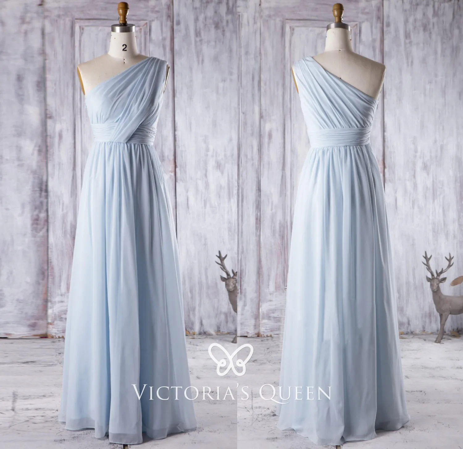 Cheap light blue pleated chiffon bridesmaid dress. Elegant one-shoulder A-line floor-length long wedding guest or evening dress.