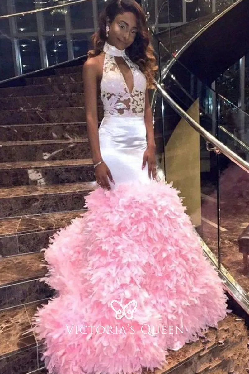 See-through light pink sequin lace cut-out bodice with a halter high neckline, drop waist pink feather skirt long trumpet African American prom dress, low back, medium train.