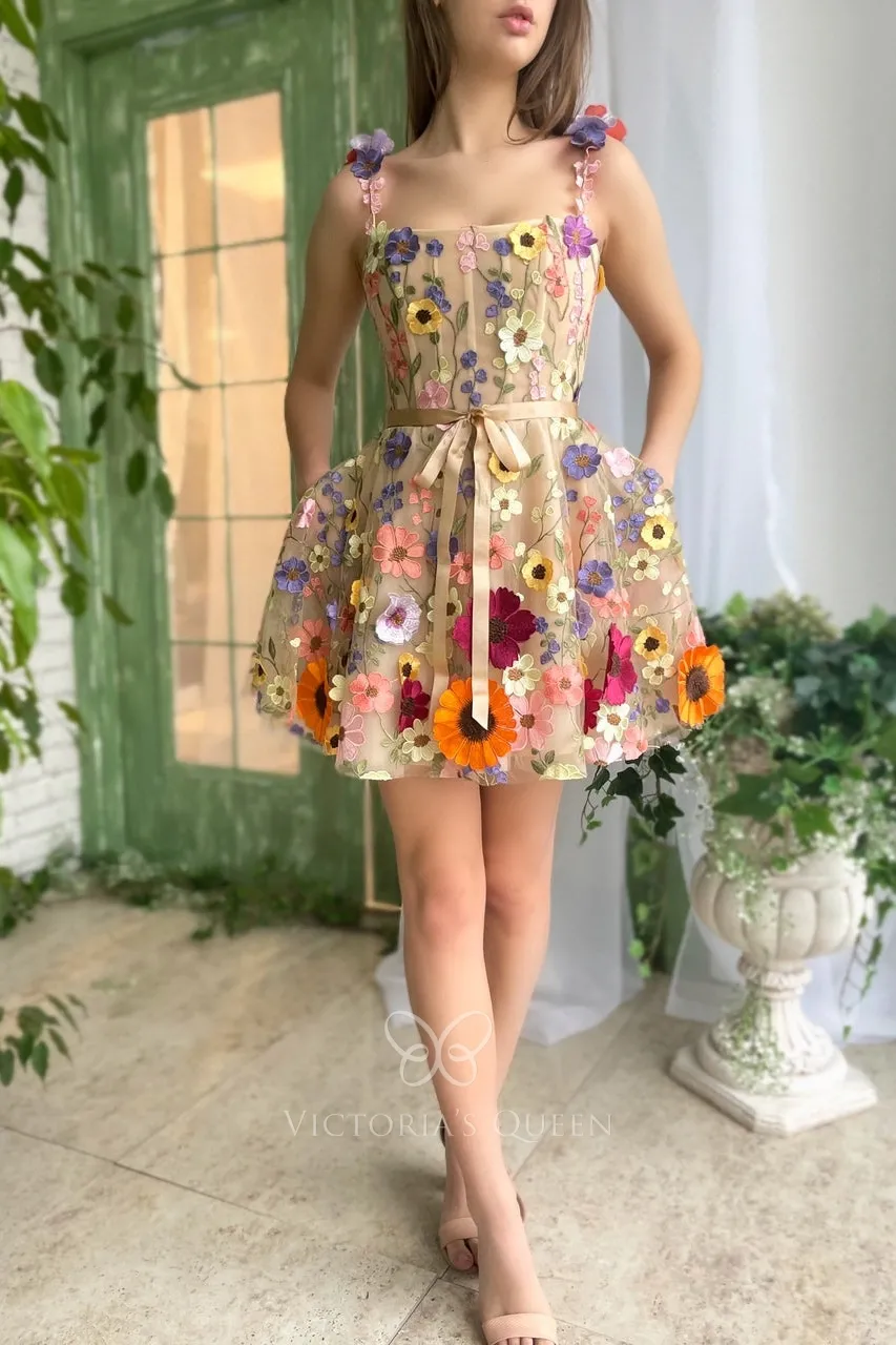 This cute short birthday dress showcases intricate multi-color 3D flower lace over a nude lining, adding a touch of elegance to your look. The corset bodice, adorned with flower-embellished straps, ensures both support and comfort. Practical pockets and a waist-cinching belt highlight your figure while providing a polished finish. Perfect for prom, homecoming, birthdays, or cocktail parties, this fairytale dress guarantees you'll be the center of attention at any event.