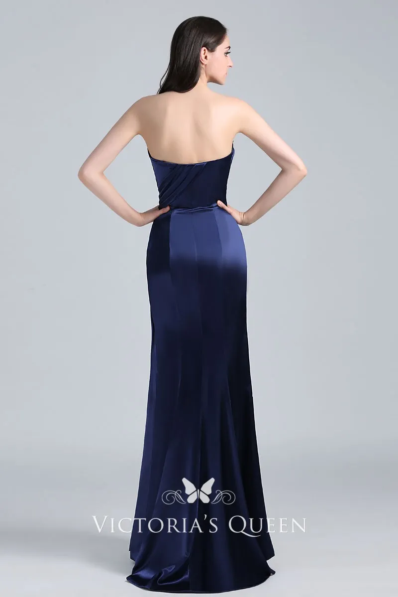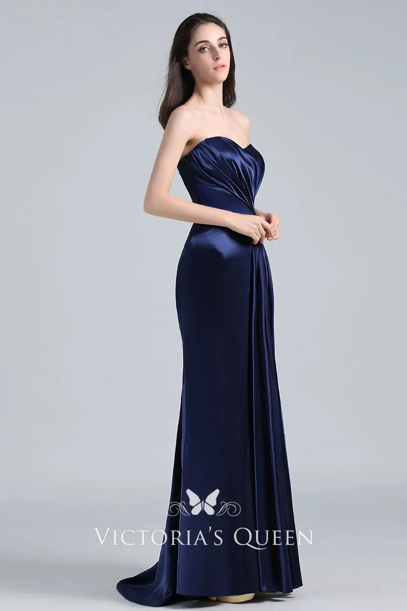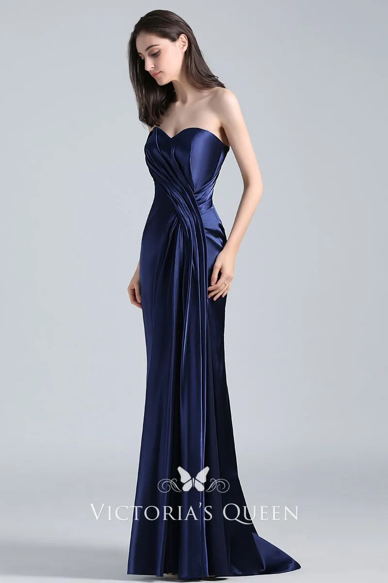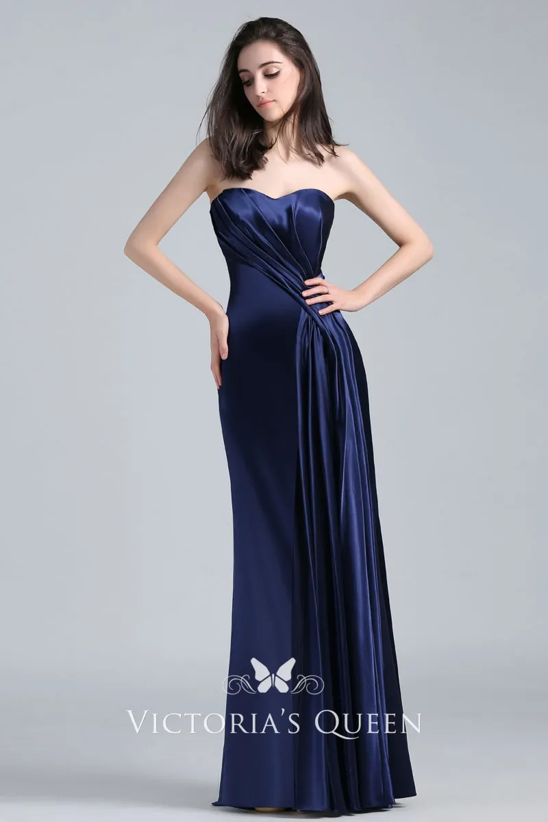 Navy Blue Draped Satin Vintage Strapless Prom Dress