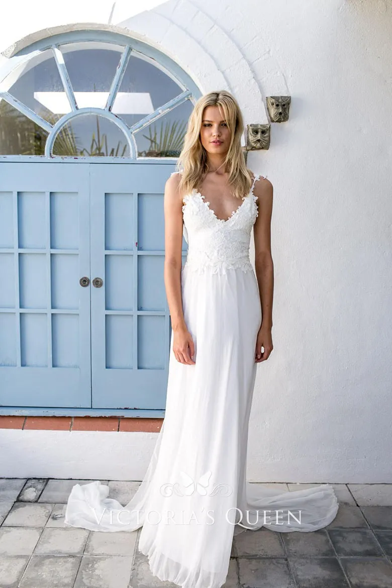 Low back white boho beach wedding dress made of chiffon and lace with spaghetti straps, a V neckline, lace bodice with a flowing chiffon skirt finished this sexy dress.