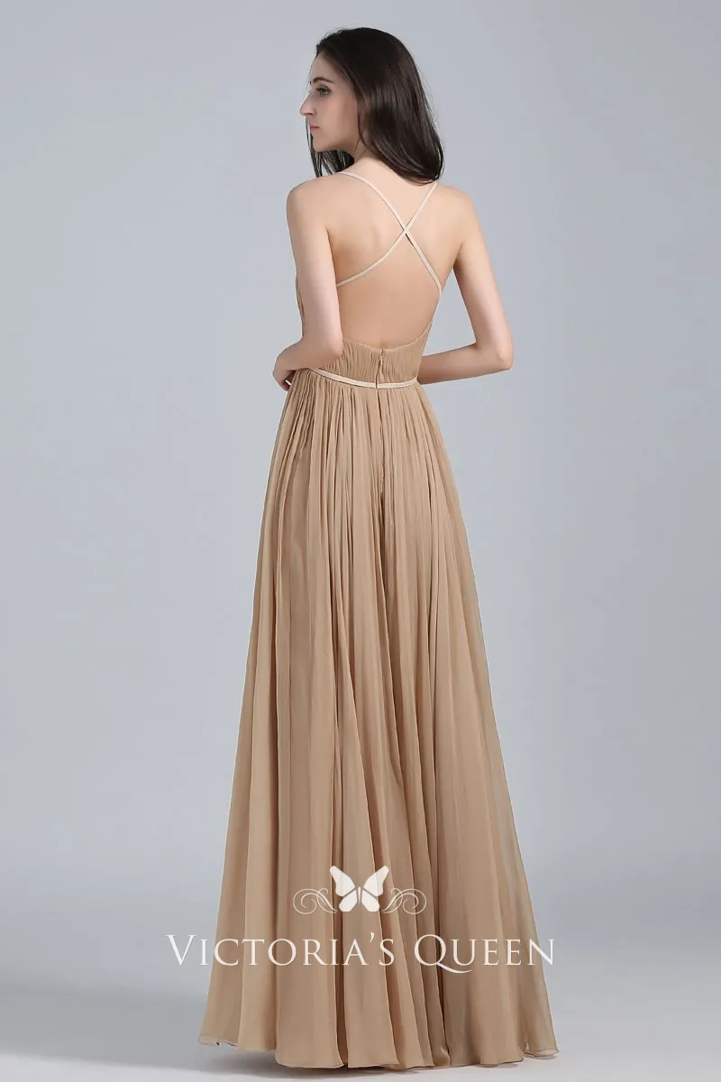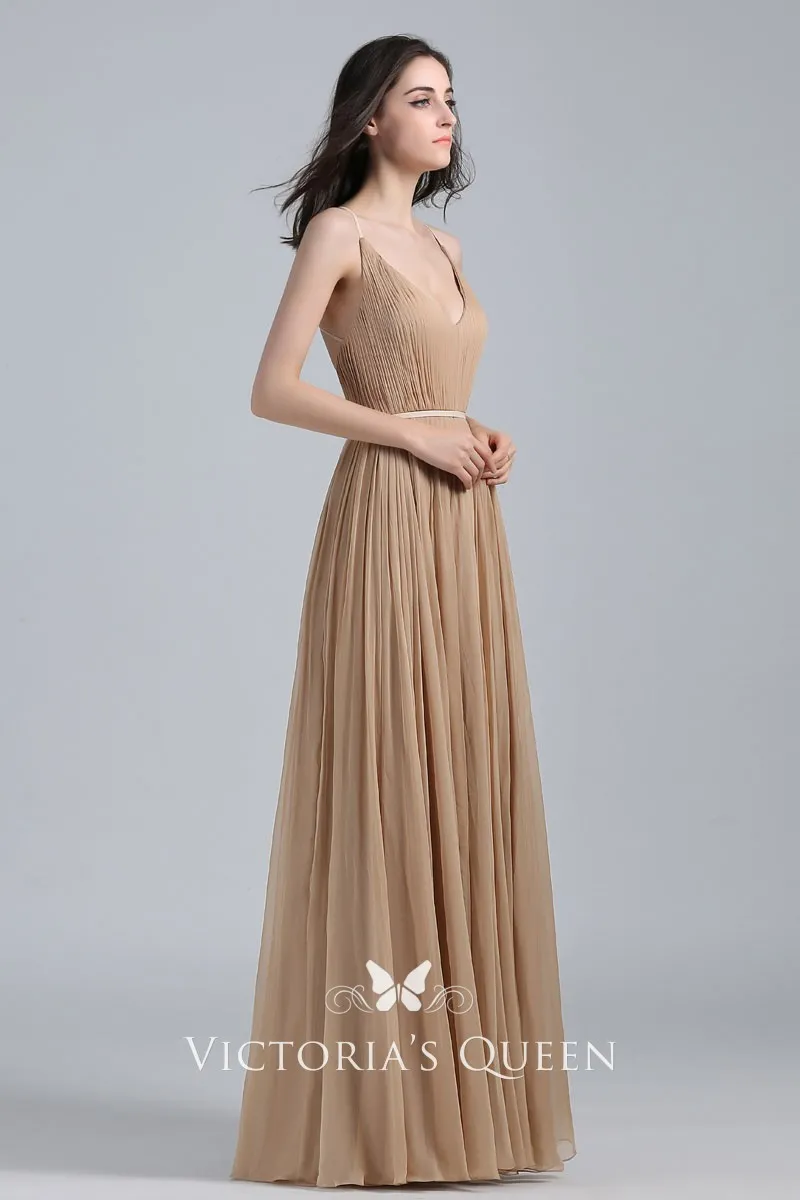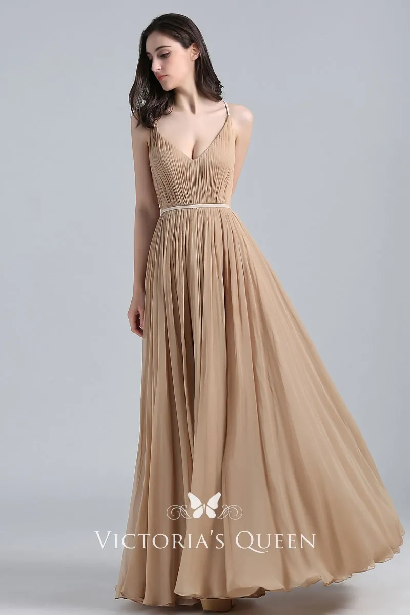 Pleated Champagne Chiffon V-neck A-line Prom Dress