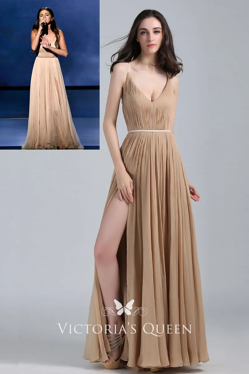 Selena Gomez's champagne prom evening or military ball dress at the 2014 American Music Awards. Deep V neckline, sleeveless, pleated champagne floor length A-line celebrity dress. Side slit skirt. Sexy crisscross straps low back.