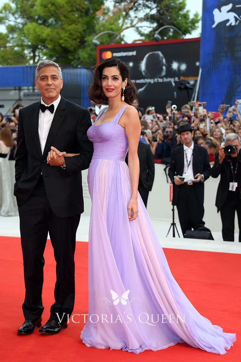 Amal Clooney in a pleated lavender chiffon long evening prom or red carpet dress with wide shoulder straps at the 74th annual Venice Film Festival 2017 red carpet.