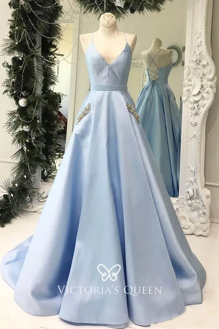 Make an extraordinary statement when you walk in this pretty light yellow satin long prom, military ball, or engagement dress. V neckline, beaded pockets, and low back with spaghetti straps. Puffy long satin skirt with a short train.