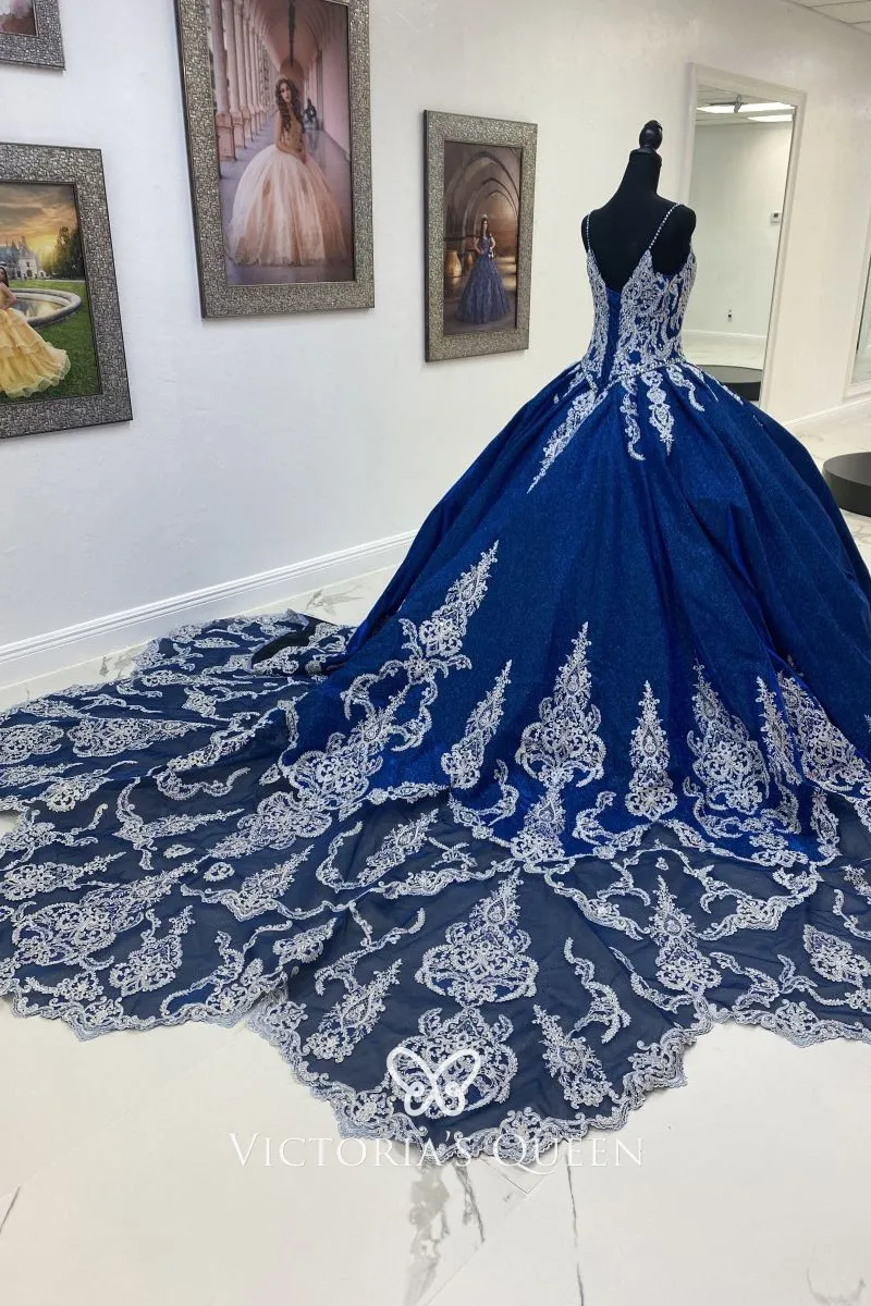 This elegant embroidered lace cobalt blue satin ball gown quinceanera, sweet-16, or prom dress features a V neckline, beaded spaghetti straps, an embroidered lace bodice with crystals and beads, a basque waist, a lace-up back, and a scalloped long train.
