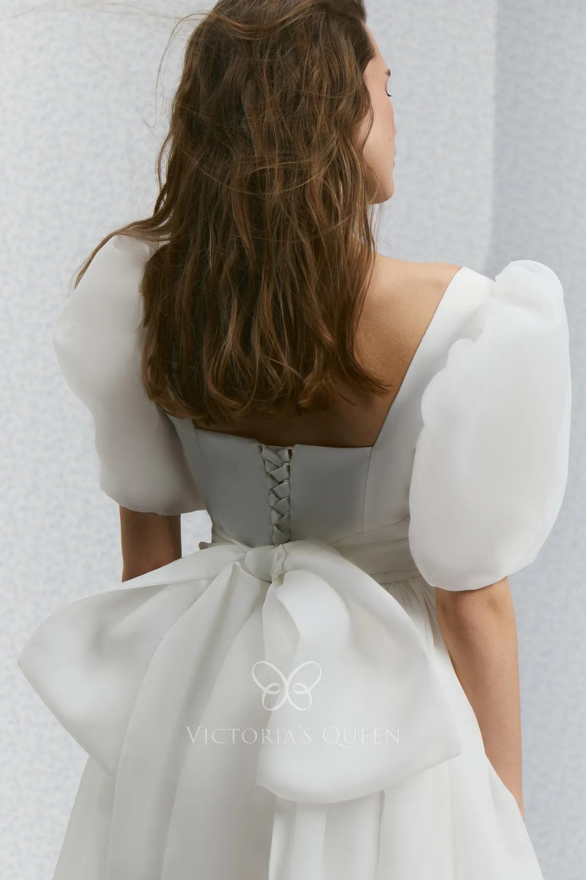 This cute ivory organza bridal formal dress is a perfect blend of simplicity and sweetness. Featuring short puff sleeves and a flattering square neckline. The bow-adorned lace-up back adds a delightful touch of romance, while the puffy long skirt flows gracefully and finishes with a subtle short train. This dress is an ideal choice for a bridal shower, reception, engagement photoshoot, or even a second wedding.
