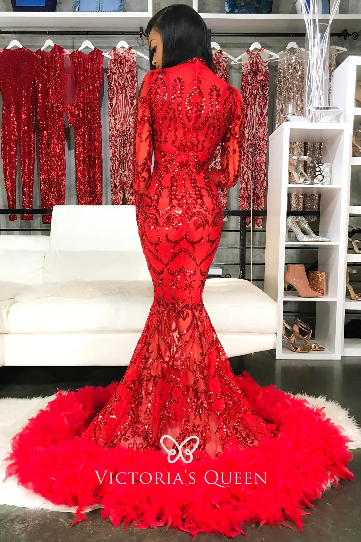 Embrace a style that will always look alluring in this luxury red sequin with ostrich feather trim unique African American sparkly prom evening dress. High neckline, long sleeves, closed back, mermaid silhouette.