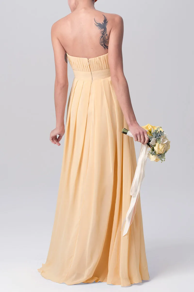 Modern ruched champagne chiffon strapless A-line long bridesmaid dress. Beaded belt. Strapless ruched chiffon prom evening dress.